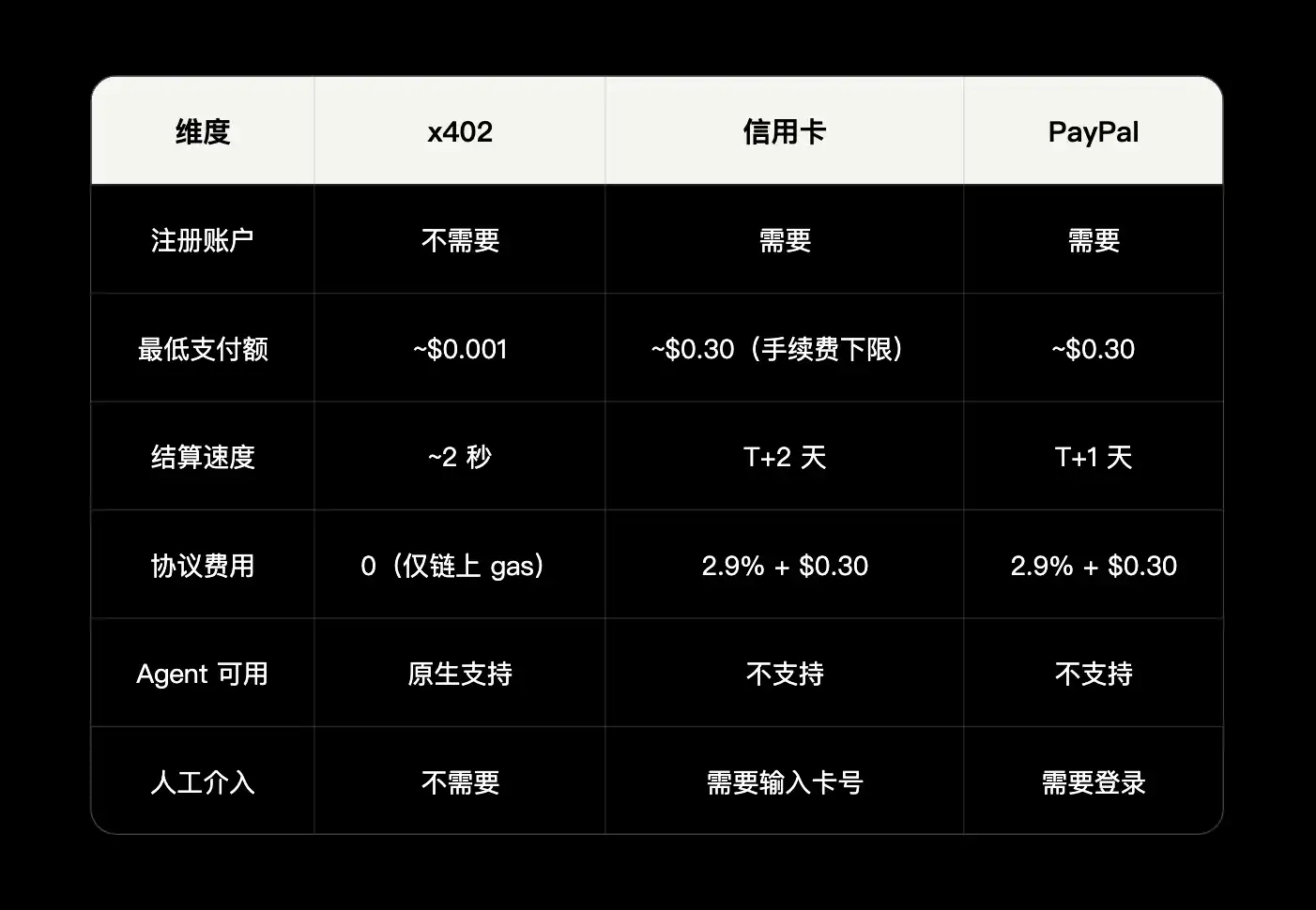 另外,信用卡有 chargeback 机制(消费者可以争议交易并追回资金),这是几十年建立起来的消费者保护。链上支付是 final settlement,付出去就是付出去了,没有 chargeback。这意味着如果 Agent 误操作(比如被 prompt injection 攻击),信用卡方案下用户可以打电话给银行追回资金。x402 方案下钱已经在链上了,追不回来。这是 x402 相对于传统支付的真实劣势。
