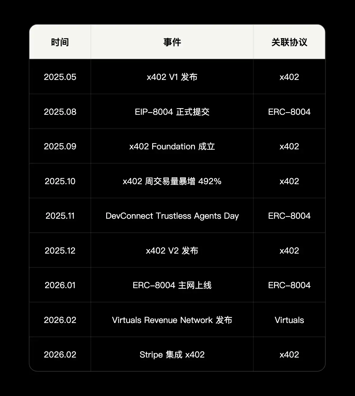 ERC-8004(信任层)由以太坊基金会 dAI 团队联合 MetaMask、Google、Coinbase 提出,为 AI Agent 提供链上身份、声誉和验证三大注册表,于 2026 年 1 月 29 日上线以太坊主网。