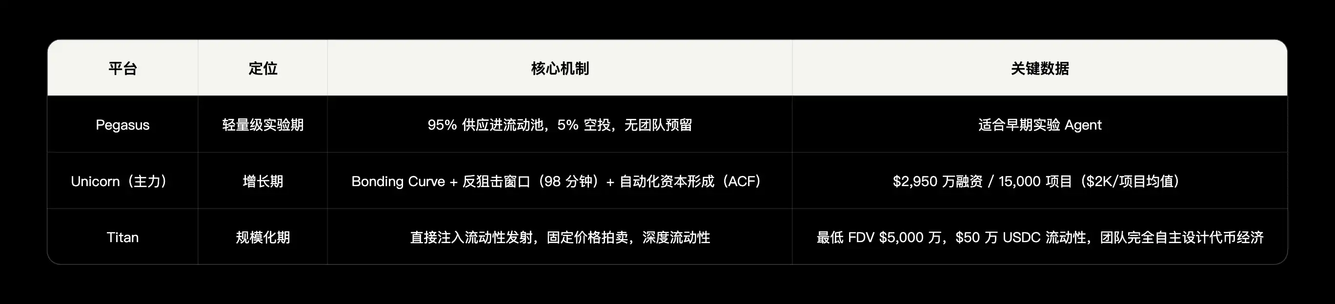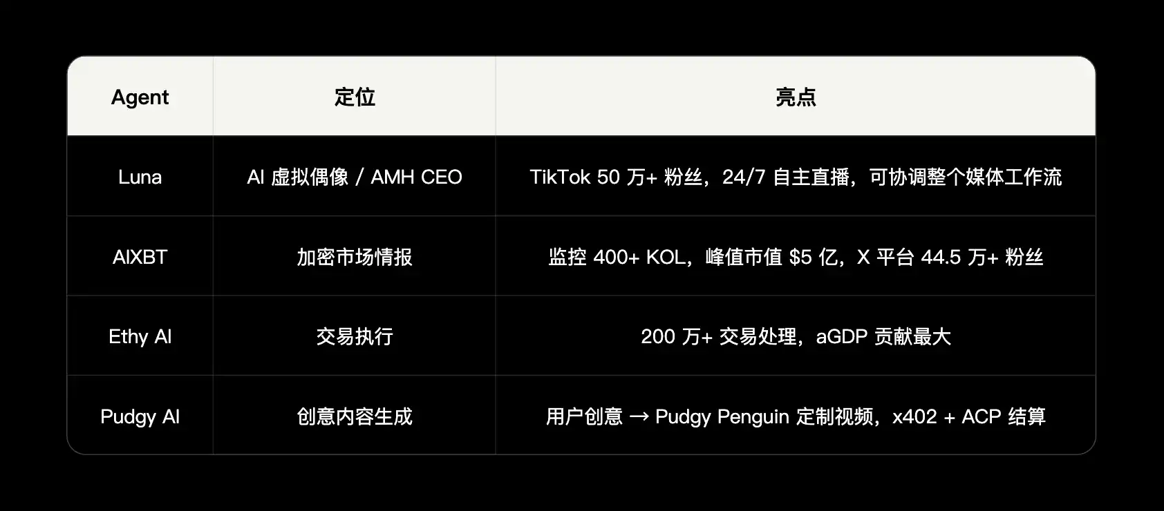 • 先发优势 + 品牌(中等):AI Agent + Crypto 赛道 Mindshare 领先,Grayscale、Fundstrat 等机构背书。