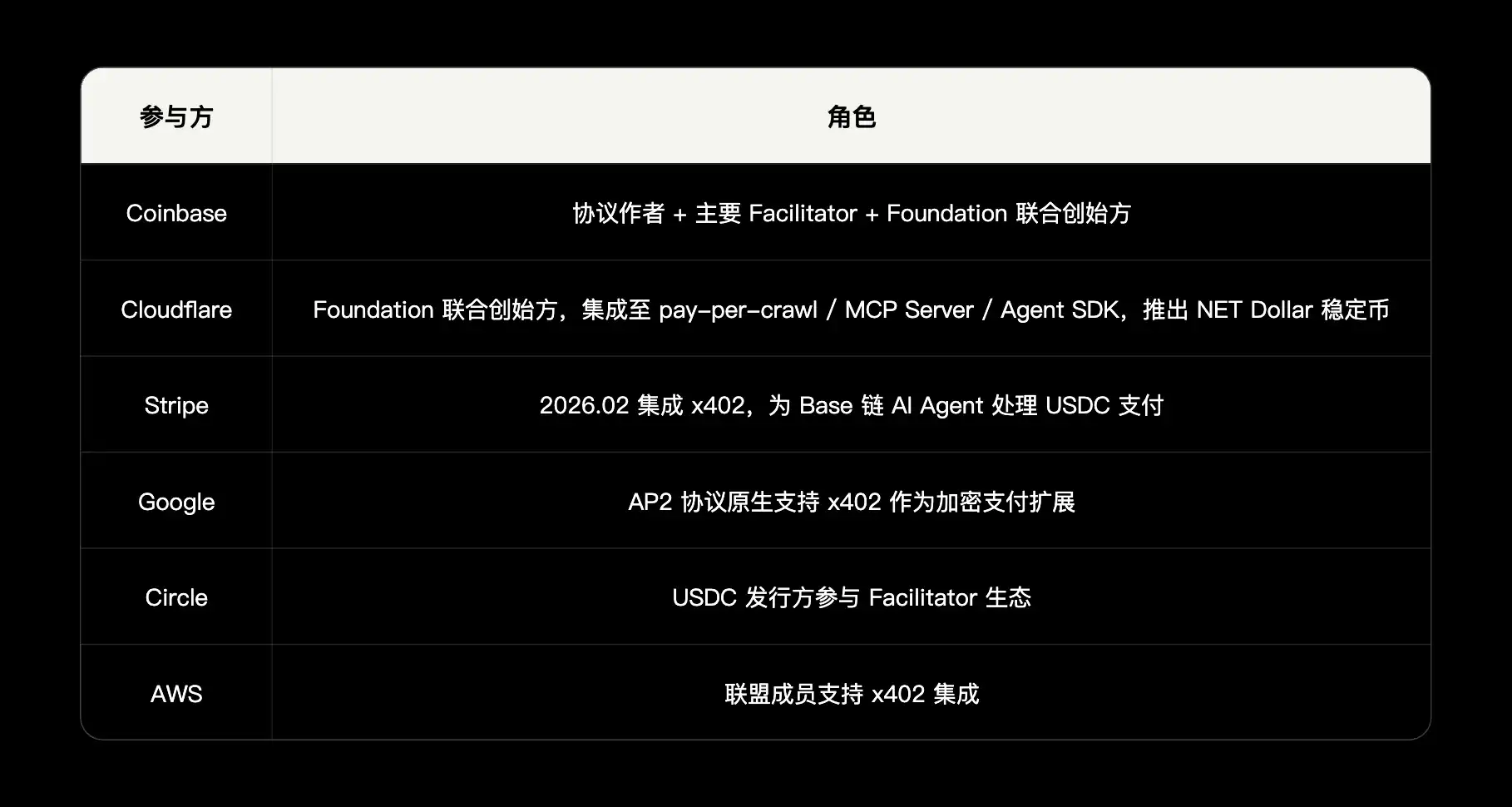 关键洞察:不是谁取代谁,而是如何组合。Google 已与 Coinbase 合作发布 A2A x402 扩展,AP2 原生将 x402 作为加密支付轨道。真正的竞争风险是标准碎片化。