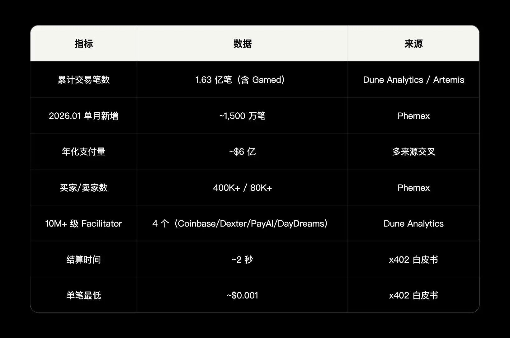 数据质量说明:据 Artemis 分析,x402 交易中 Real 与 Gamed 接近 1:1(如 2026.01.11 Real 52 万 vs Gamed 51.8 万),真实有机规模需打折理解。