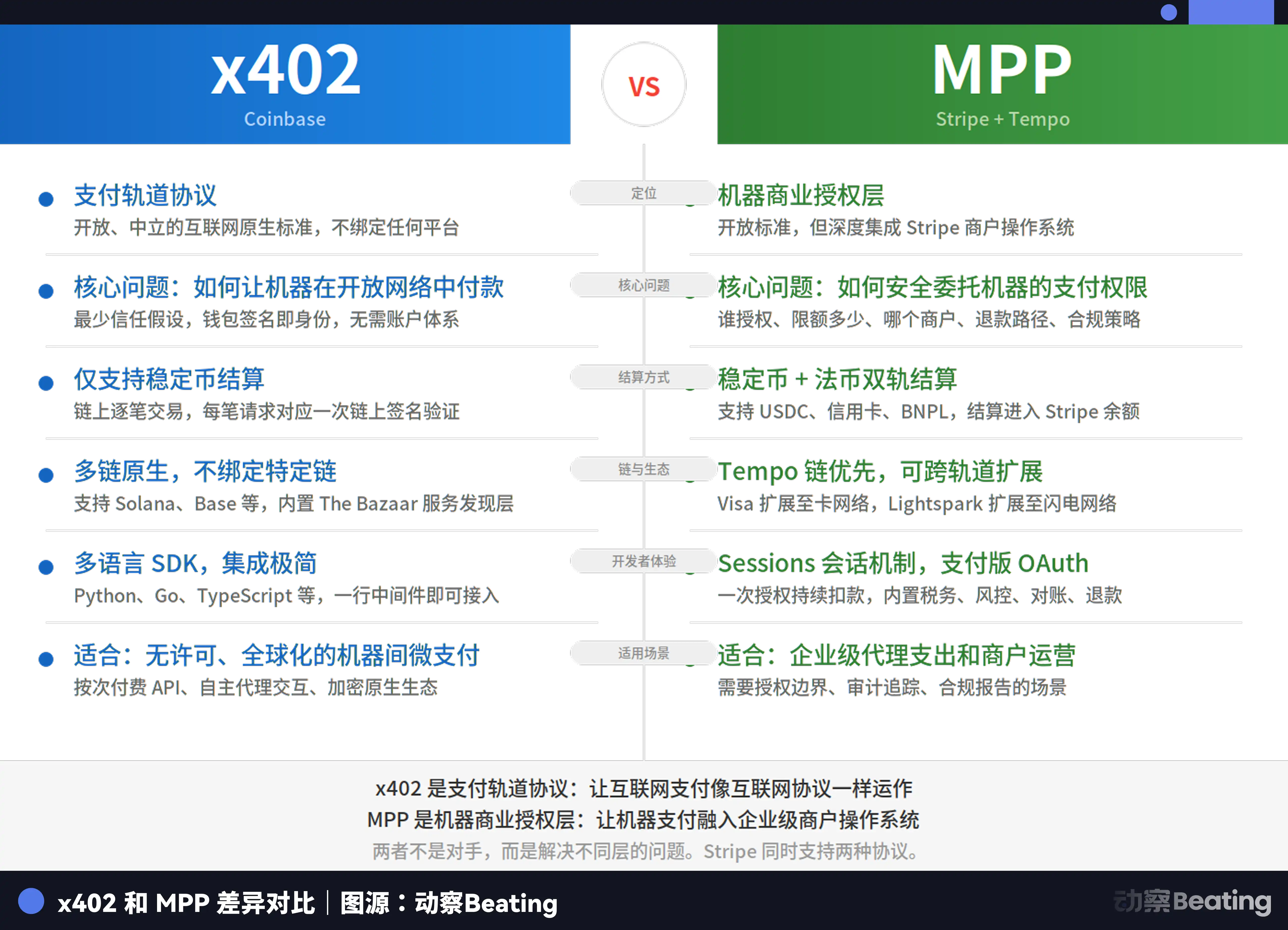 Google 年初新推出的 UCP 把所有主流标准都兼容进去,负责搜索和 Gemini 生态内的商业交易。Stripe 同 Tempo 一起上线的的 MPP 也支持 Mastercard 和 Visa 的体系接入,负责机器间的自主支付。Mastercard 的 Agent Pay 负责高价值交易的可审计授权。