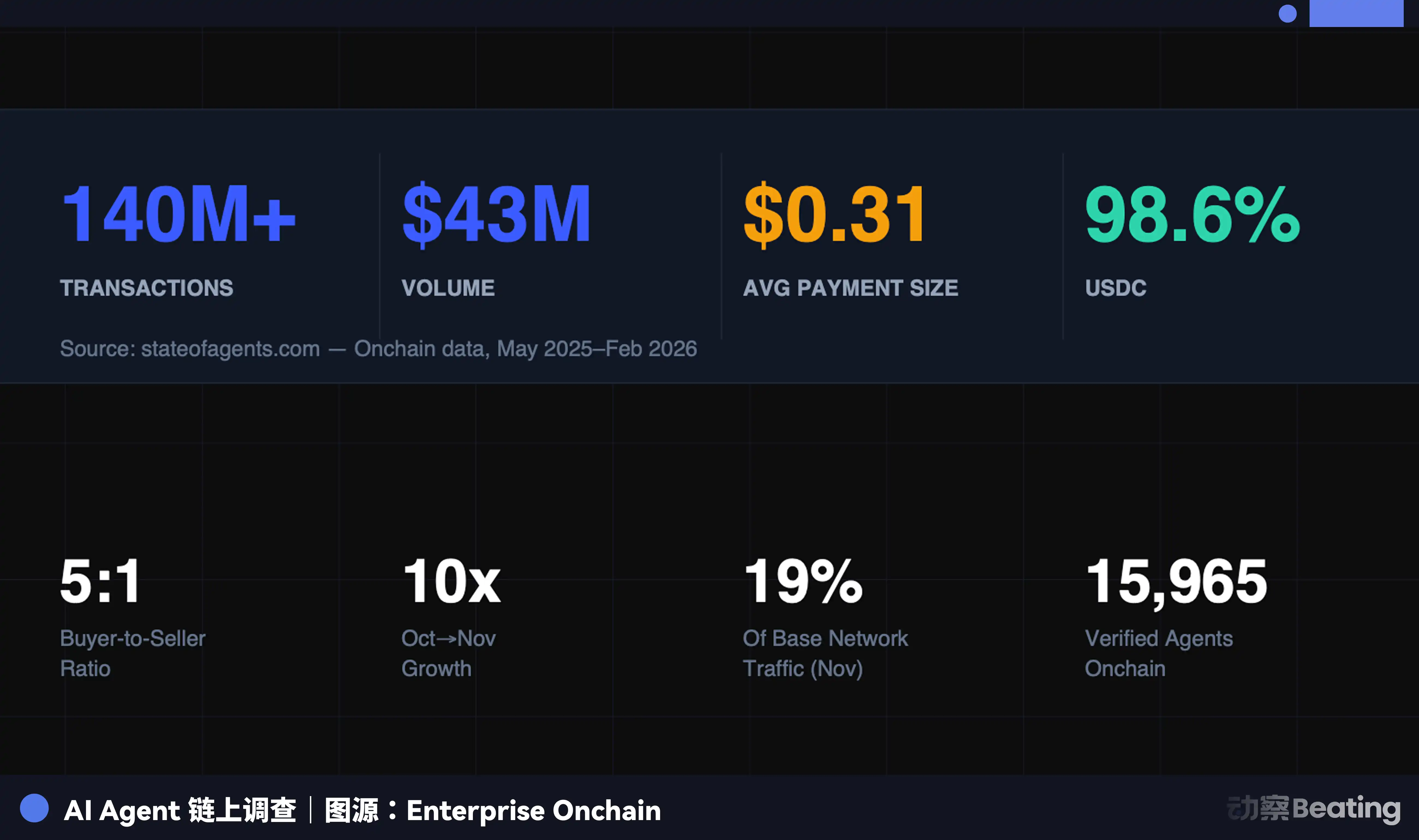 来看一组 Enterprise Onchain 发布的数据,过去 9 个月,AI Agent 完成 1.4 亿笔支付,总额 4300 万美元,98.6% 使用 USDC,平均每笔 0.31 美元,拥有购买力的 AI Agent 已经超过 40 万个。