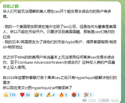 方程式新闻的创始人,00 后天才交易员 Vida 曾在 Telegram 上分享了一些见闻,来解释为何老外们疯狂看好 Hyperliquid。据 X 用户 JinMu 提供的截图,Vida 将原因归结为严格的 KYC 和美国本土交易平台糟糕的用户体验。