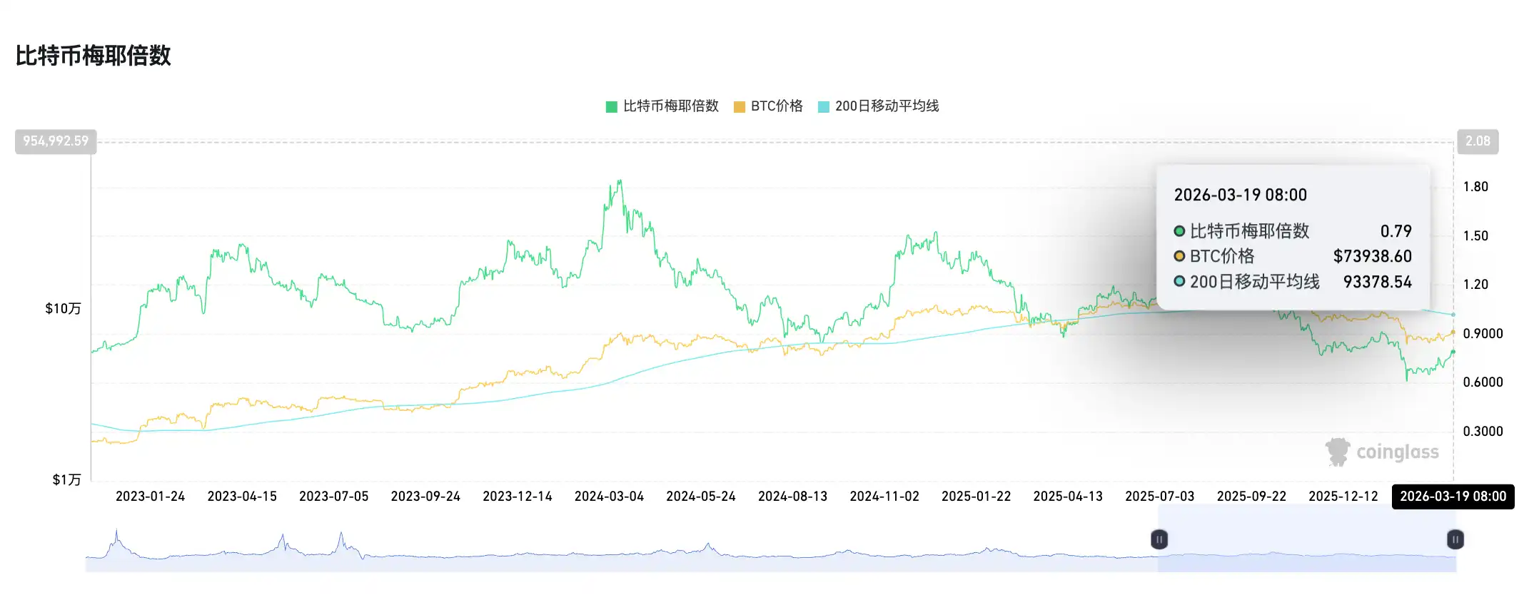 指标四:BTC 梅耶指数,低于 0.8 已持续近 50 天