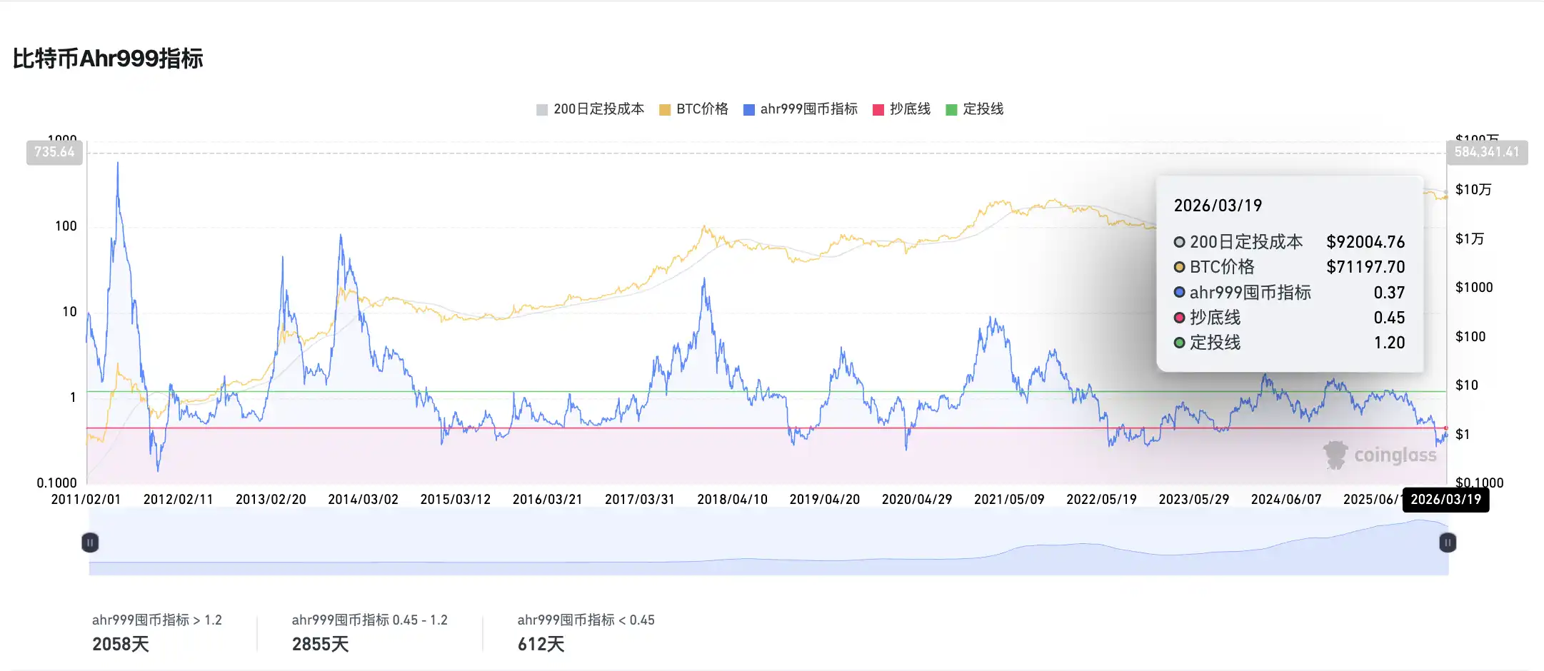 指标二:Ahr999 指数(9 神指数),0.45 以下抄底区间已持续近 50 天