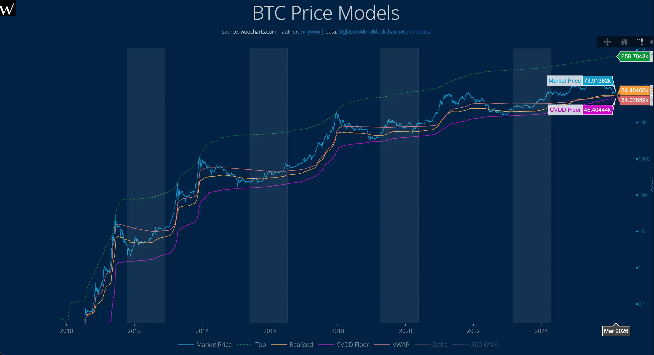 该指标由加密分析师 Willy Woo 开发,用于追踪 BTC 在不同价格区间的累积持有权重,构建一条「历史性铁底」曲线。