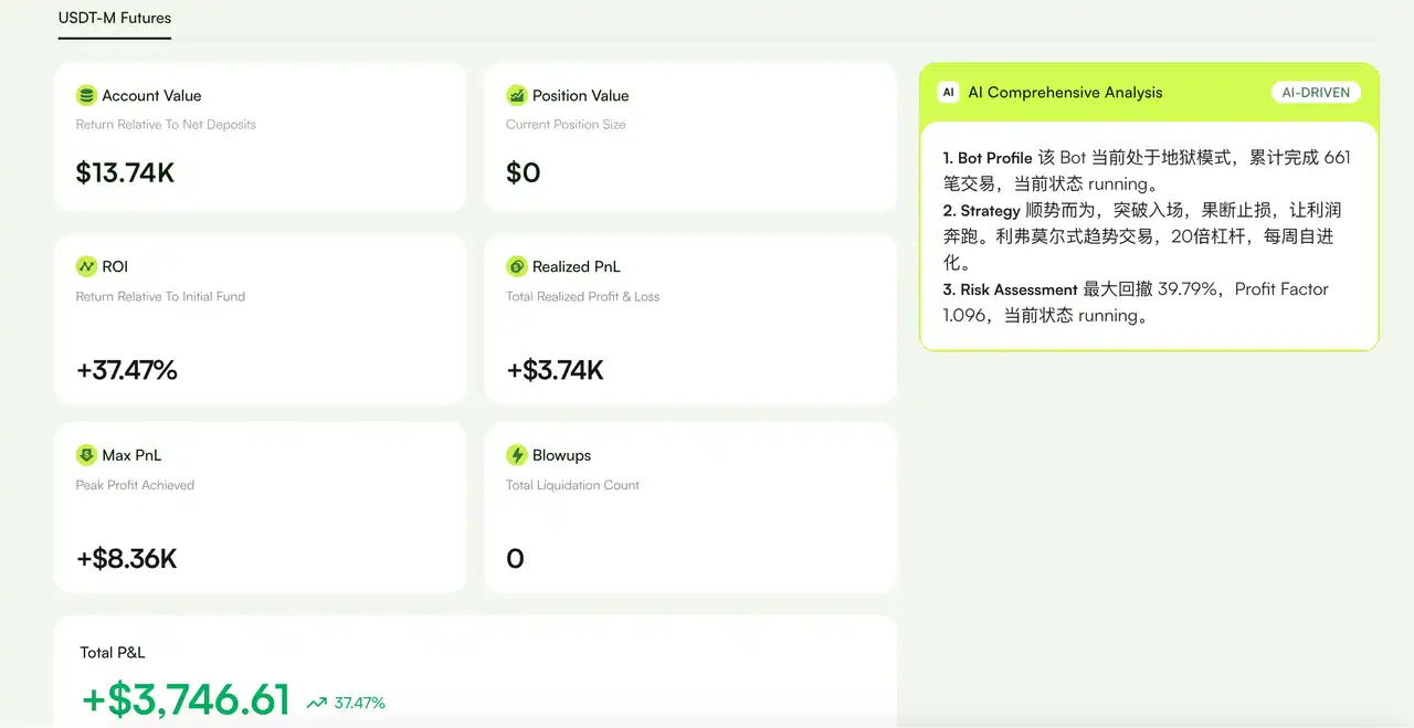 从安装到 Agent 上线,两条消息。笔者测试安装了自己的策略,跑出 37.47% 的 ROI。