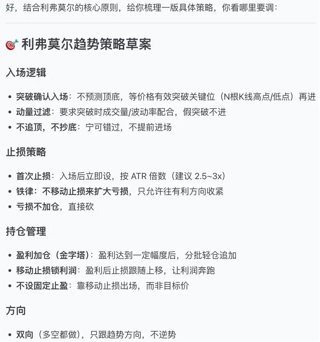 举几个例子。你说「我想做趋势反转」,它生成一个趋势反转 Agent。你说「多空对冲稳如狗」,它就按这个风格配参数。你说「激进波动猎手」,它给你造一个高频高波动的策略。