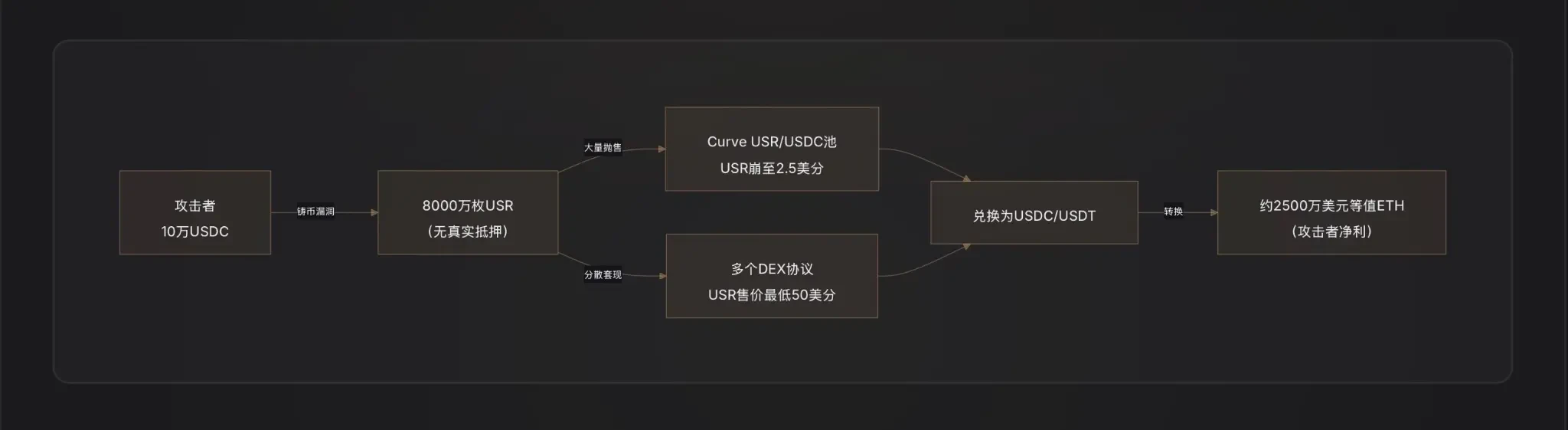 攻击手法: 攻击者仅用约10万美元USDC,利用USR铸币函数中的关键漏洞——可能是预言机被操控、链下签名者密钥遭到泄露,或铸币请求与执行之间缺乏金额校验——凭空铸造了8000万枚USR(价值约8000万美元),随后迅速兑换为真实资产。