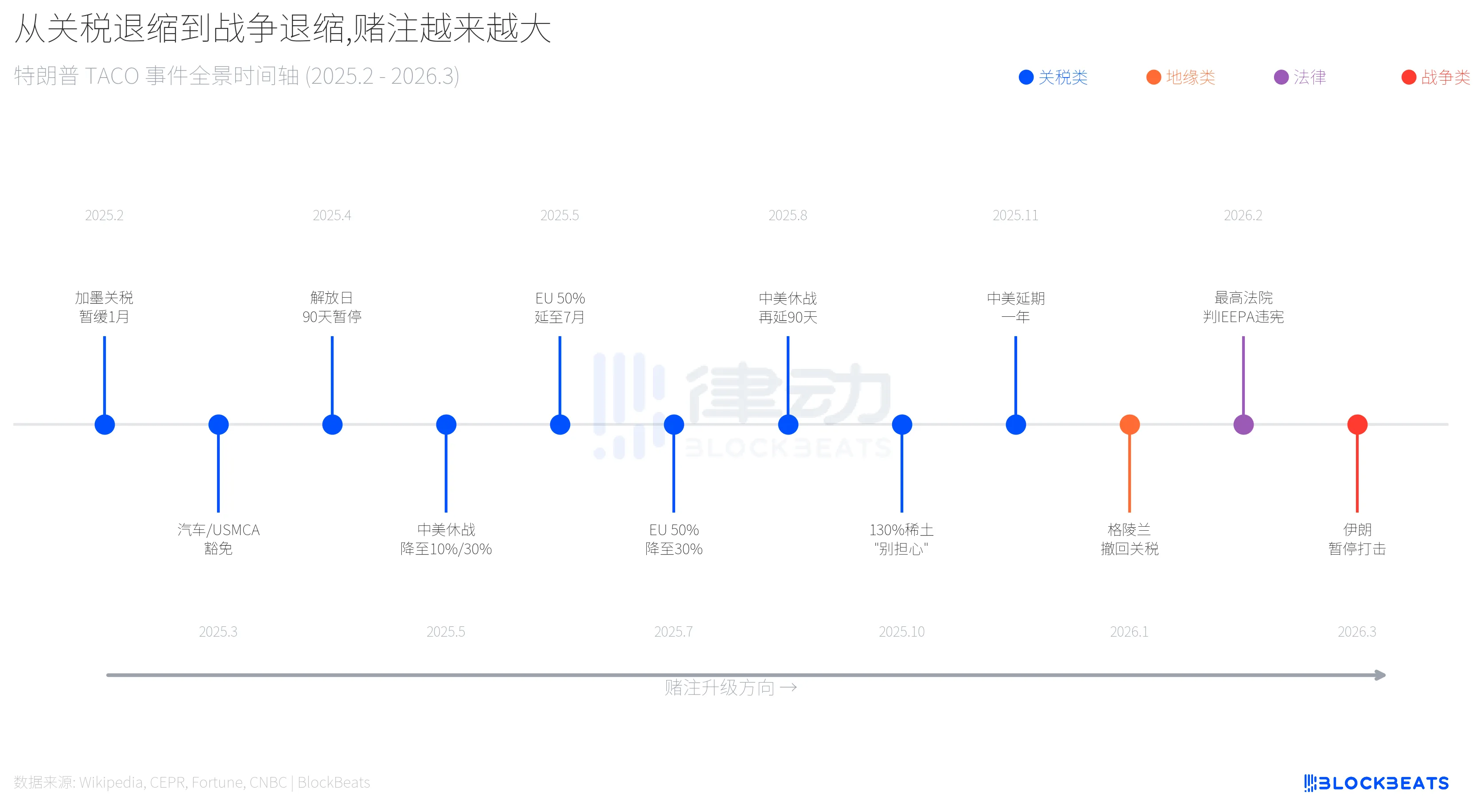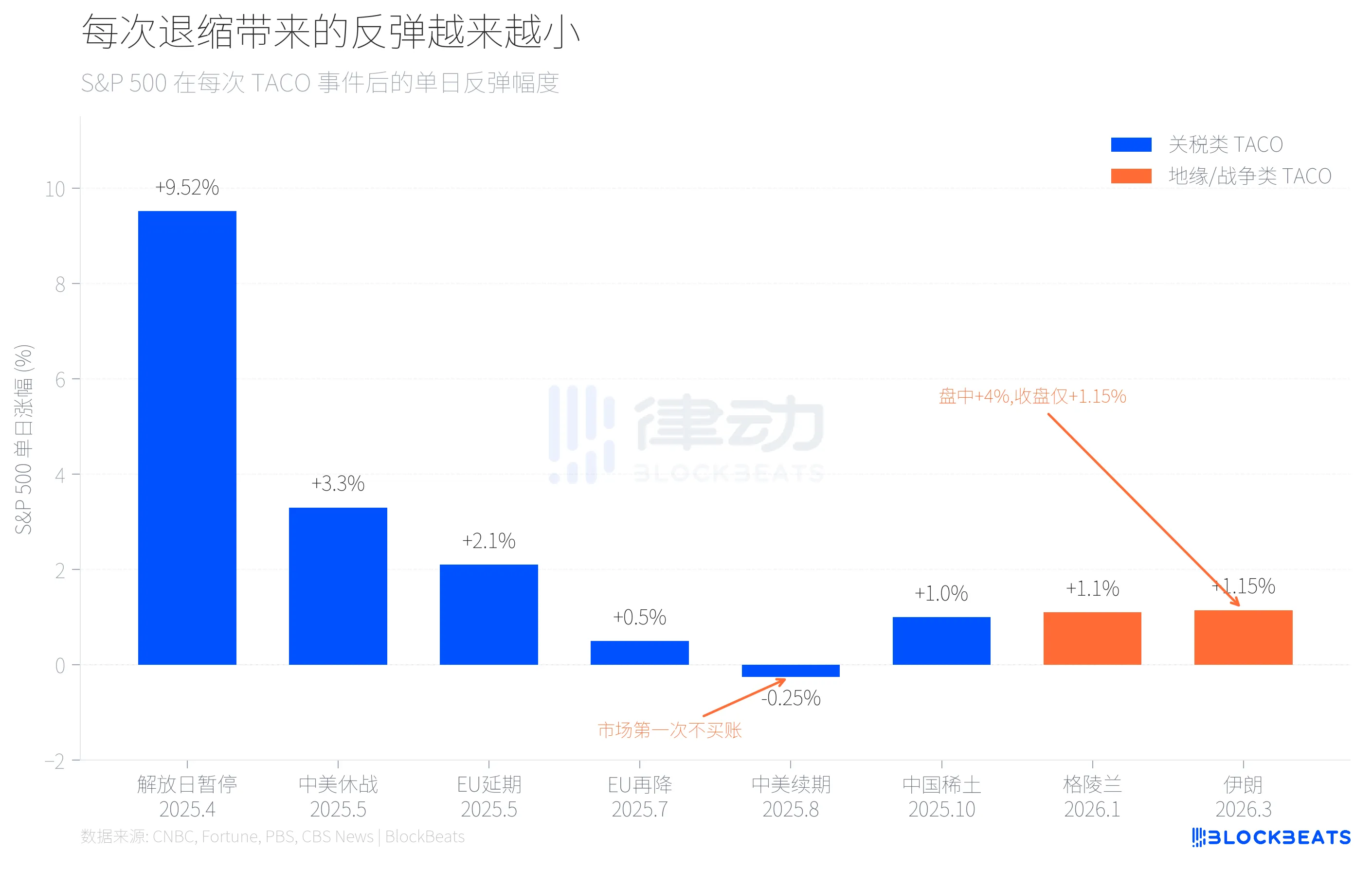 从 4 月 9 日的 +9.52%,到 3 月 23 日盘中 +4% 但收盘仅 +1.15%。TACO 交易用 14 个月走完了从暴利到失效的完整周期。不是特朗普不退缩了,是退缩本身已经被市场定价了。当「退缩」变成共识预期,它就不再是退缩,而是噪音。
