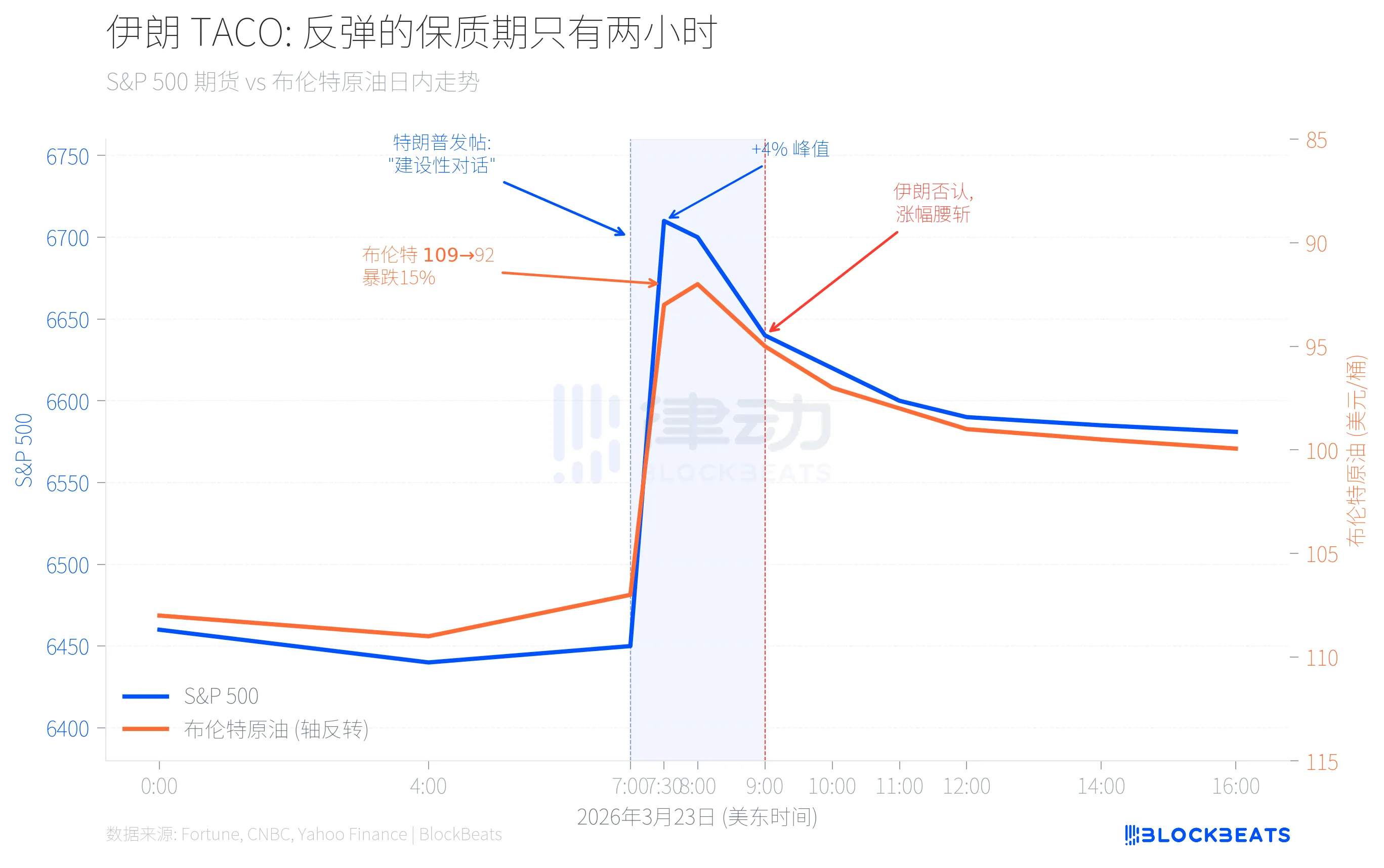 这是 TACO 模式的质变时刻。关税时代的退缩是单方面的,总统一个帖子就能兑现。战争时代的退缩需要对手配合。当对手否认,退缩就变成了谎言。而布伦特原油当天虽然从 109 美元跌至 92 美元的盘中低点,收盘仍在 99.94 美元。霍尔木兹海峡的实际供应风险不会因为一条帖子消失。