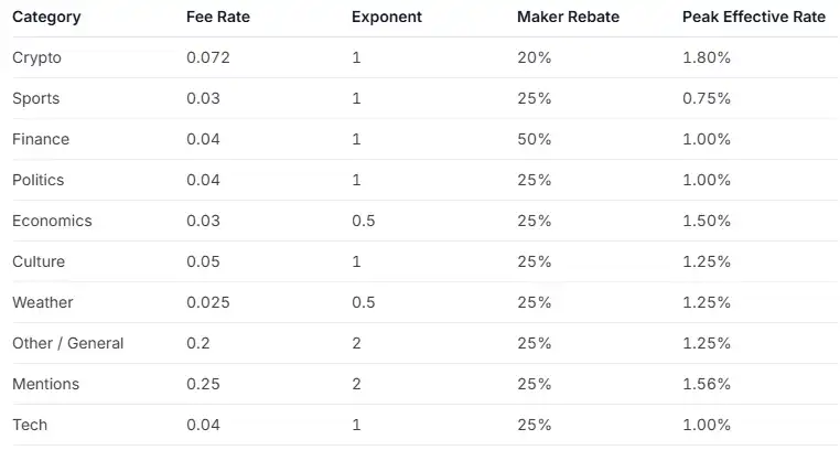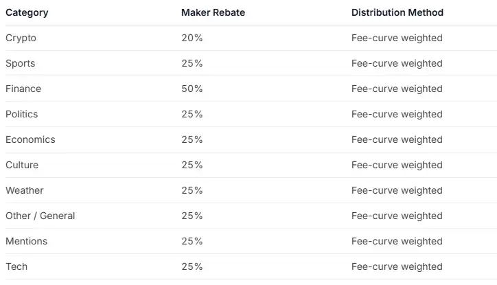 在当前费率体系下,Crypto 市场峰值有效费率约为 1.56%,Sports 约为 0.44%。而在即将生效的新费率结构中,不同类别差异进一步拉开,例如 Crypto 峰值约 1.80%,Finance 与 Politics 约 1.00%,Economics 可达 1.50%。同时,各类别对应的做市返利比例也同步设定,例如 Finance 高达 50%,多数其他类别在 25% 左右。