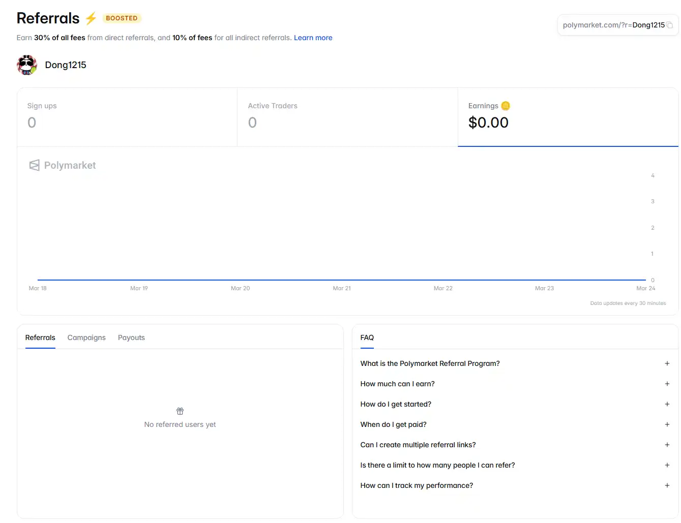 · 30% 的手续费返佣来自直接推荐,10% 的手续费返佣来自二级推荐(奖励将在用户注册 Polymarket 后的前 180 天内有效,此期限可能会有所变更,恕不另行通知);