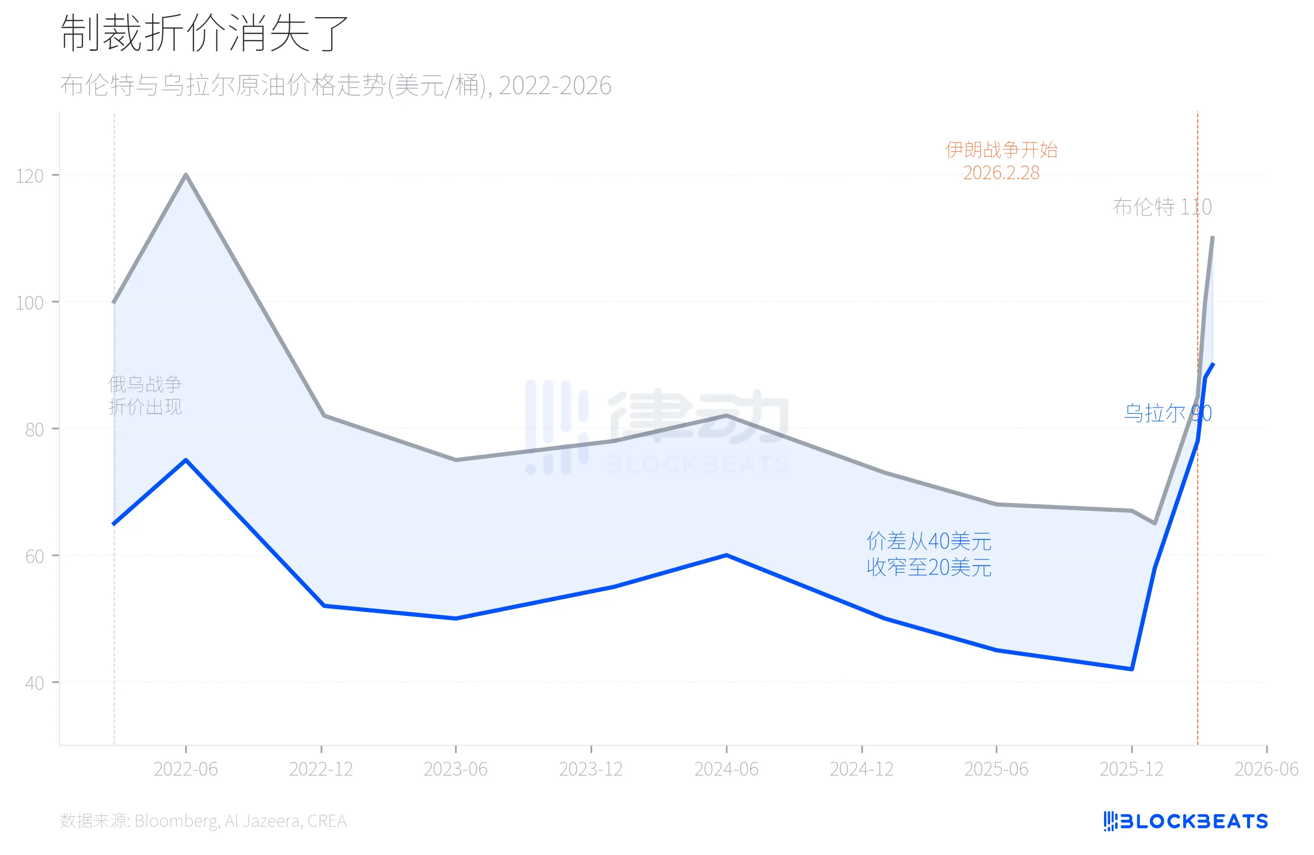 伊朗战争开始前,乌拉尔原油的交易价格不到 60 美元一桶。这个价格被锁定了将近三年,是西方制裁的直接结果。俄乌战争爆发后,欧美对俄罗斯石油实施价格上限,乌拉尔原油与国际基准布伦特之间长期维持着 30 到 40 美元的折价。这个折价是制裁在发挥作用的最直观信号。