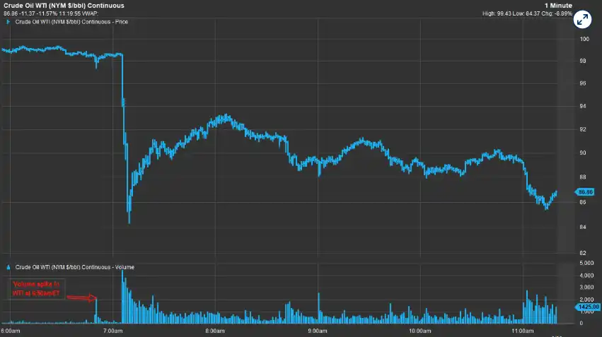 早盘期货市场通常流动性较低,这使得短暂的买卖爆发比常规交易时段更为显眼。尽管如此,这些交易仍令人侧目,因为任何在此时刻大量买入股票期货、同时卖出或做空原油期货的人,在几分钟后就赚取了巨额利润。
