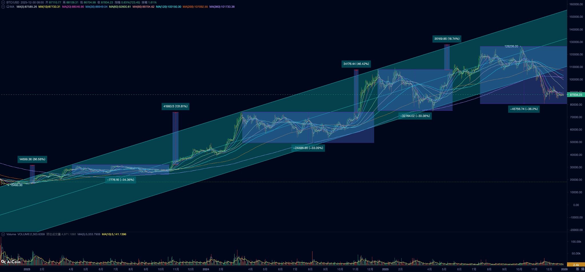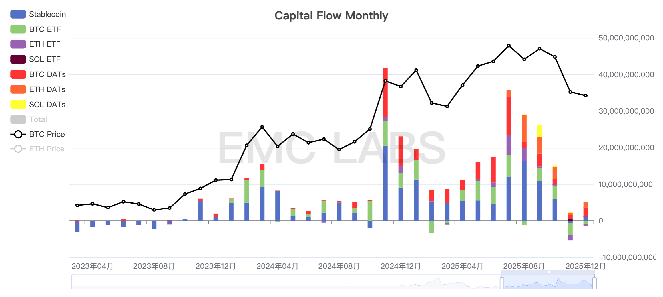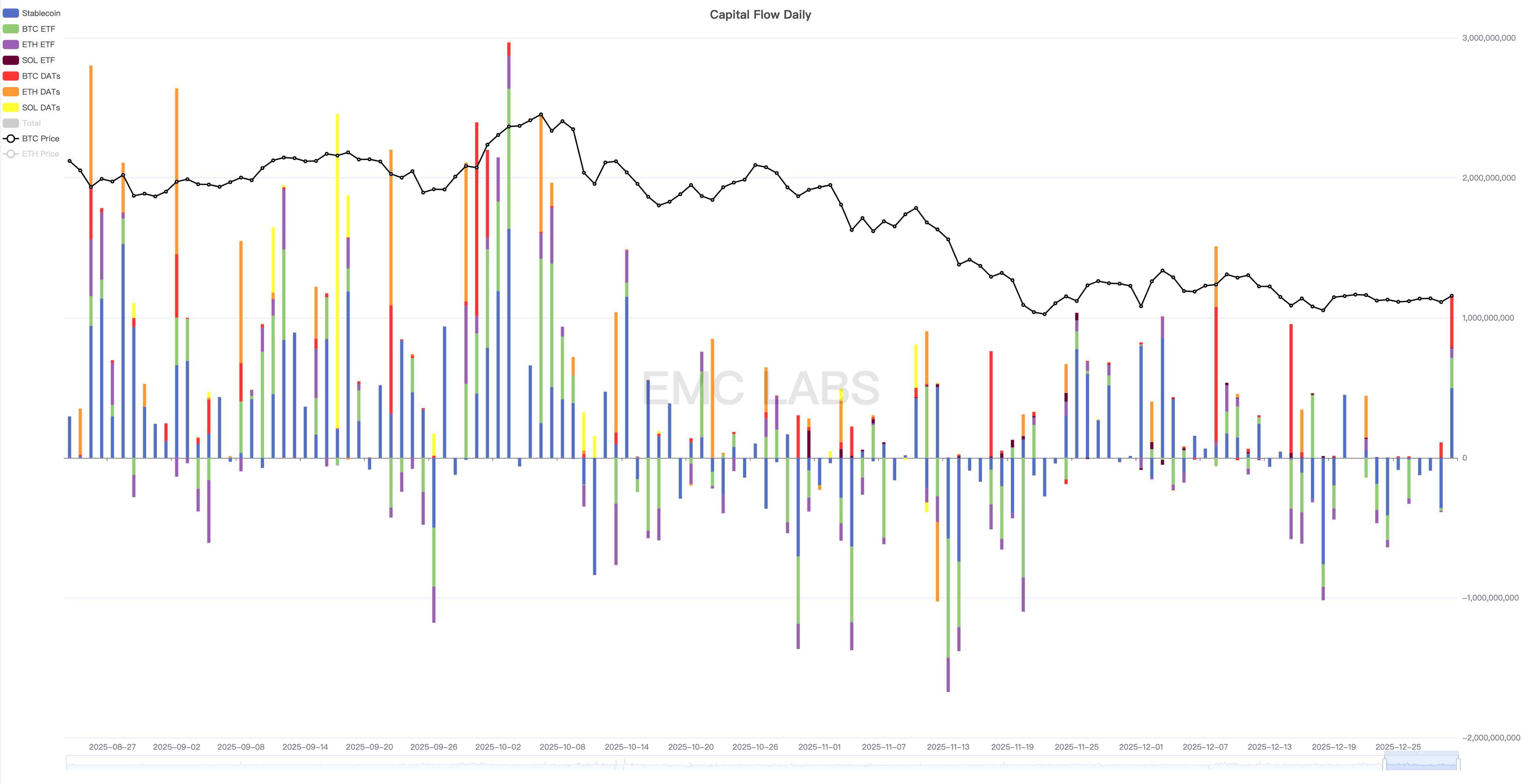 继 11 月资金大幅流出之后,12 月加密市场资金全渠道统计已录得净流入,这是价格在 80000~94000 美元区间企稳的根本原因。当然,即使在传统“深度熊市”,资金进出和抛售亦会有反复,后继需持续进行月度级别的观察。