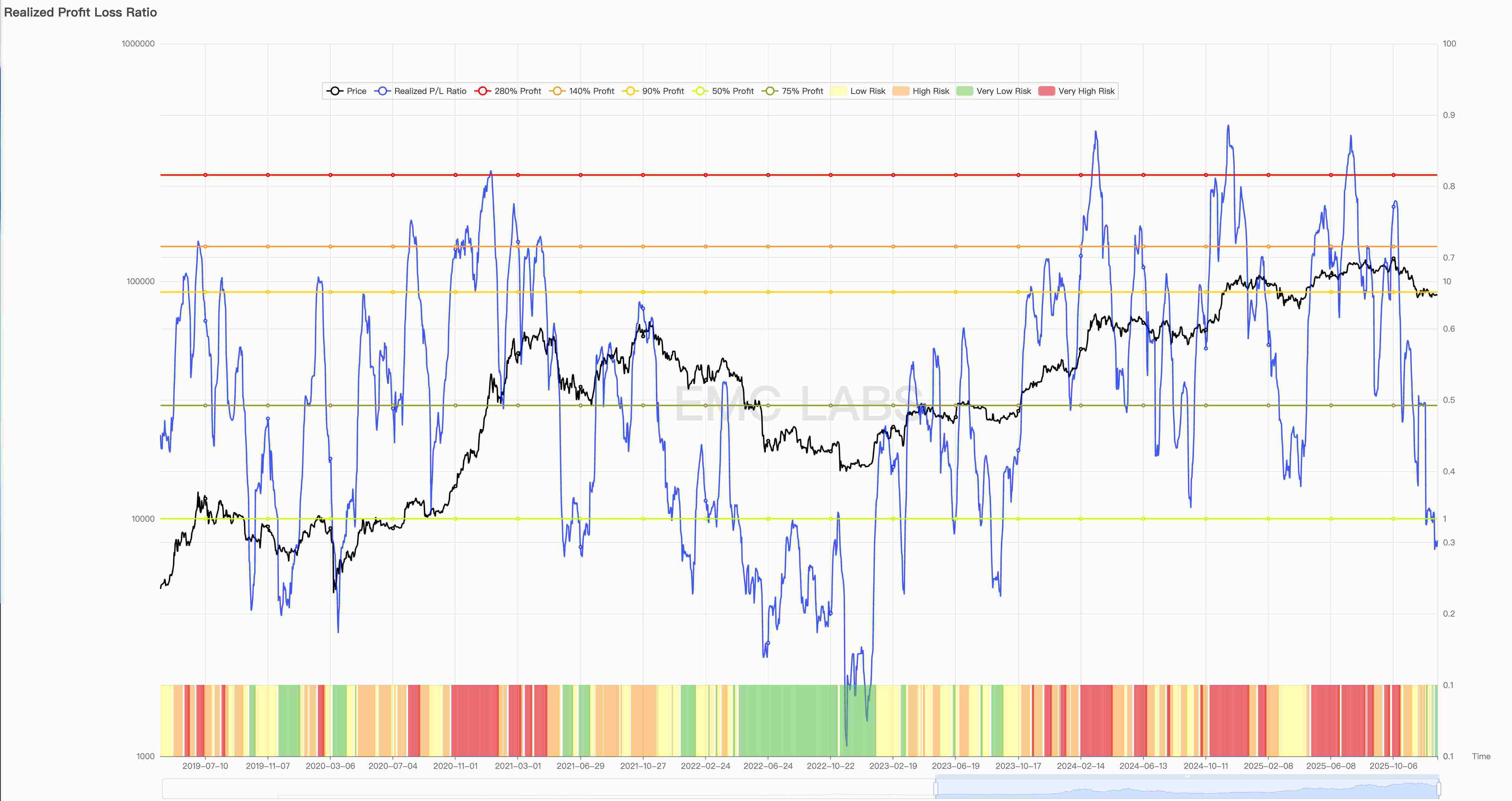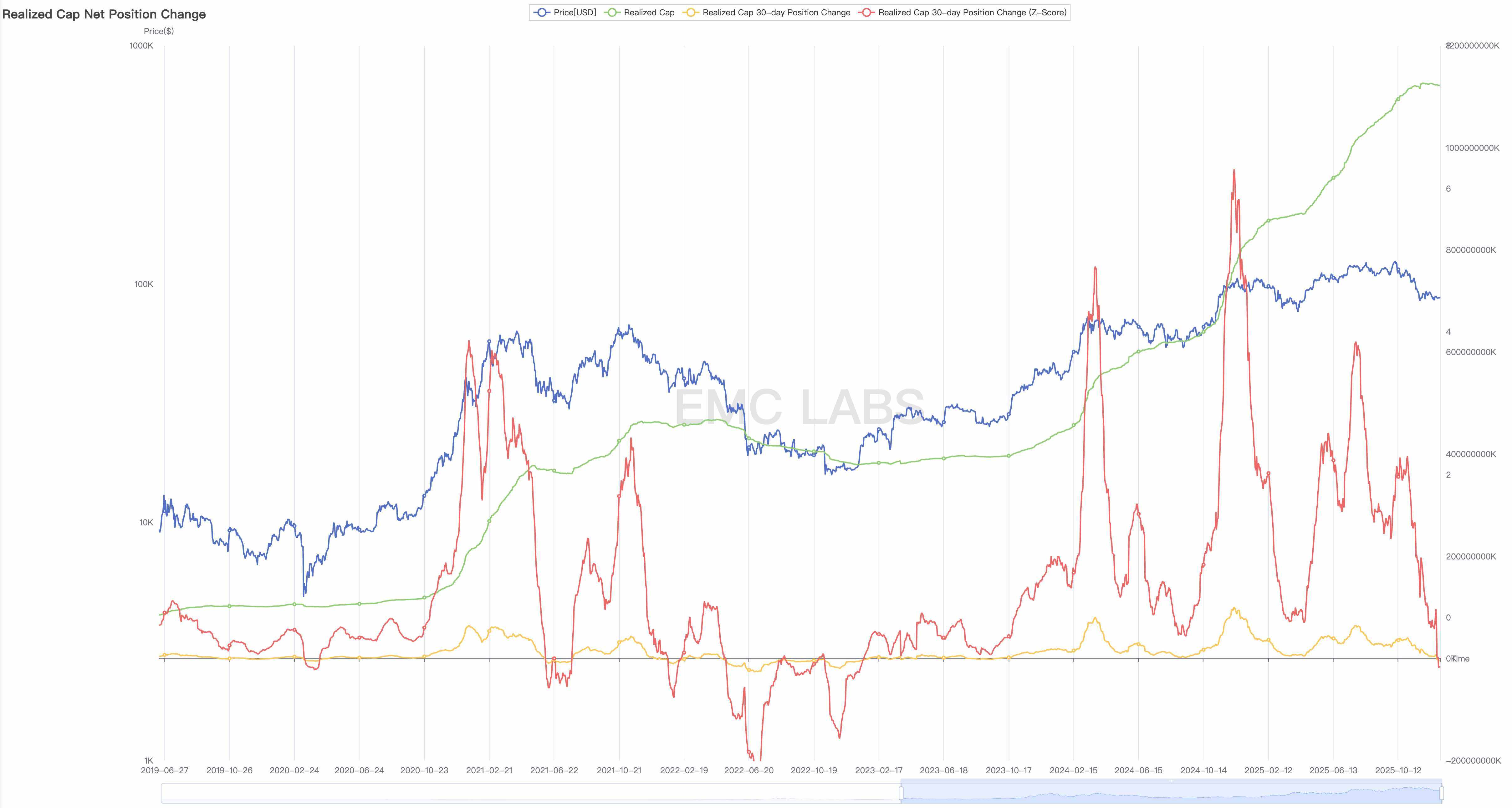 在过往周期中,持续的链上已实现市值下降往往意味着周期级“深度熊市”的价格持续跌落。这种跌落不只会进一步打击投资者信心,如果引发场内脆弱性崩溃造成连环踩踏,便会引发深度熊市,此前两次周期级深度熊市莫不如此。