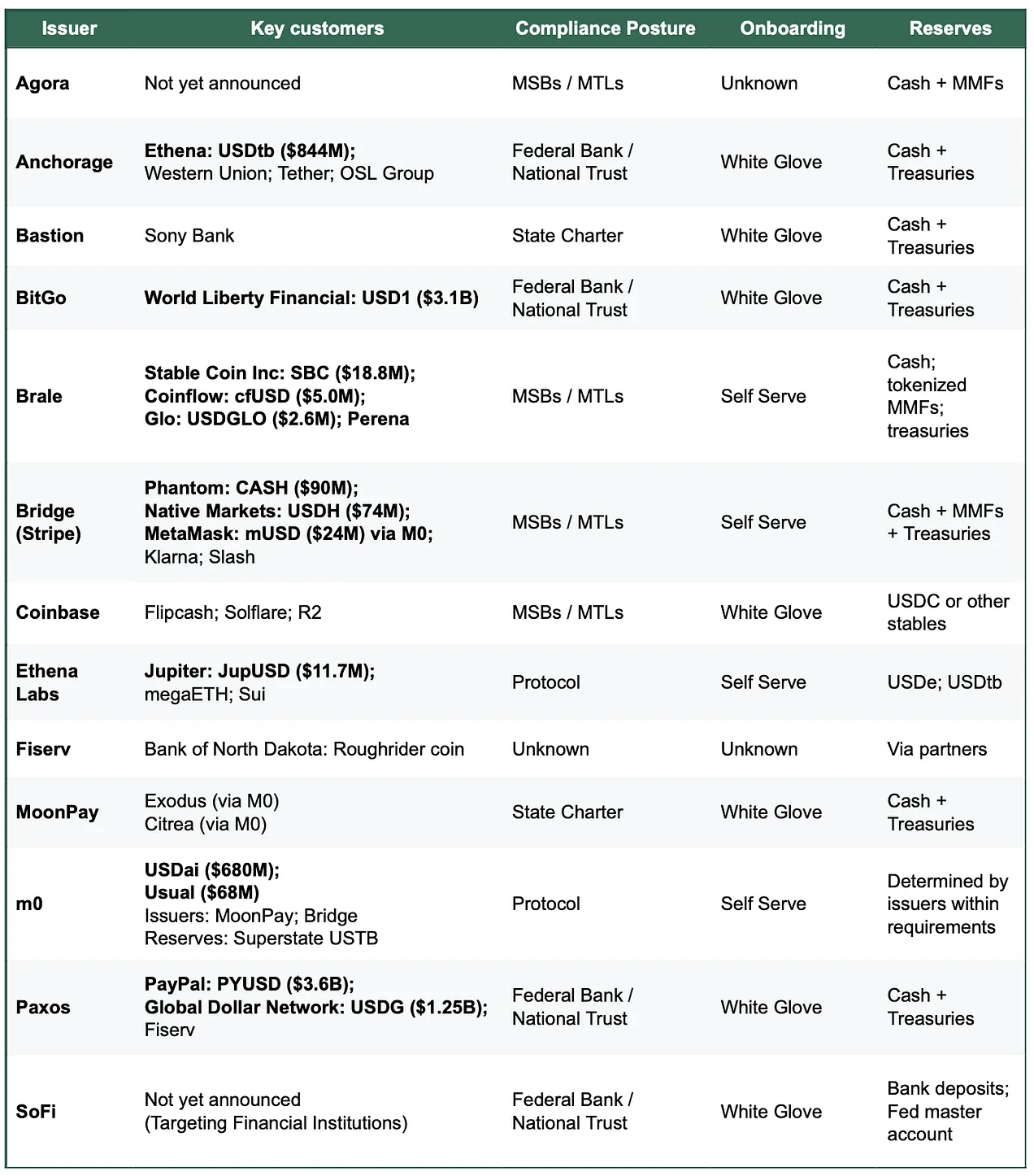 支撑这一转变的,是“稳定币发行即服务”(issuance-as-a-service)平台的爆发式增长。几年前,市场上的首选几乎只有 Paxos;而如今,根据项目类型不同,已经出现了 10 条以上可行路径,包括 Bridge、MoonPay 这样的新平台,以合规优先著称的 Anchorage,以及 Coinbase 这样的行业巨头。