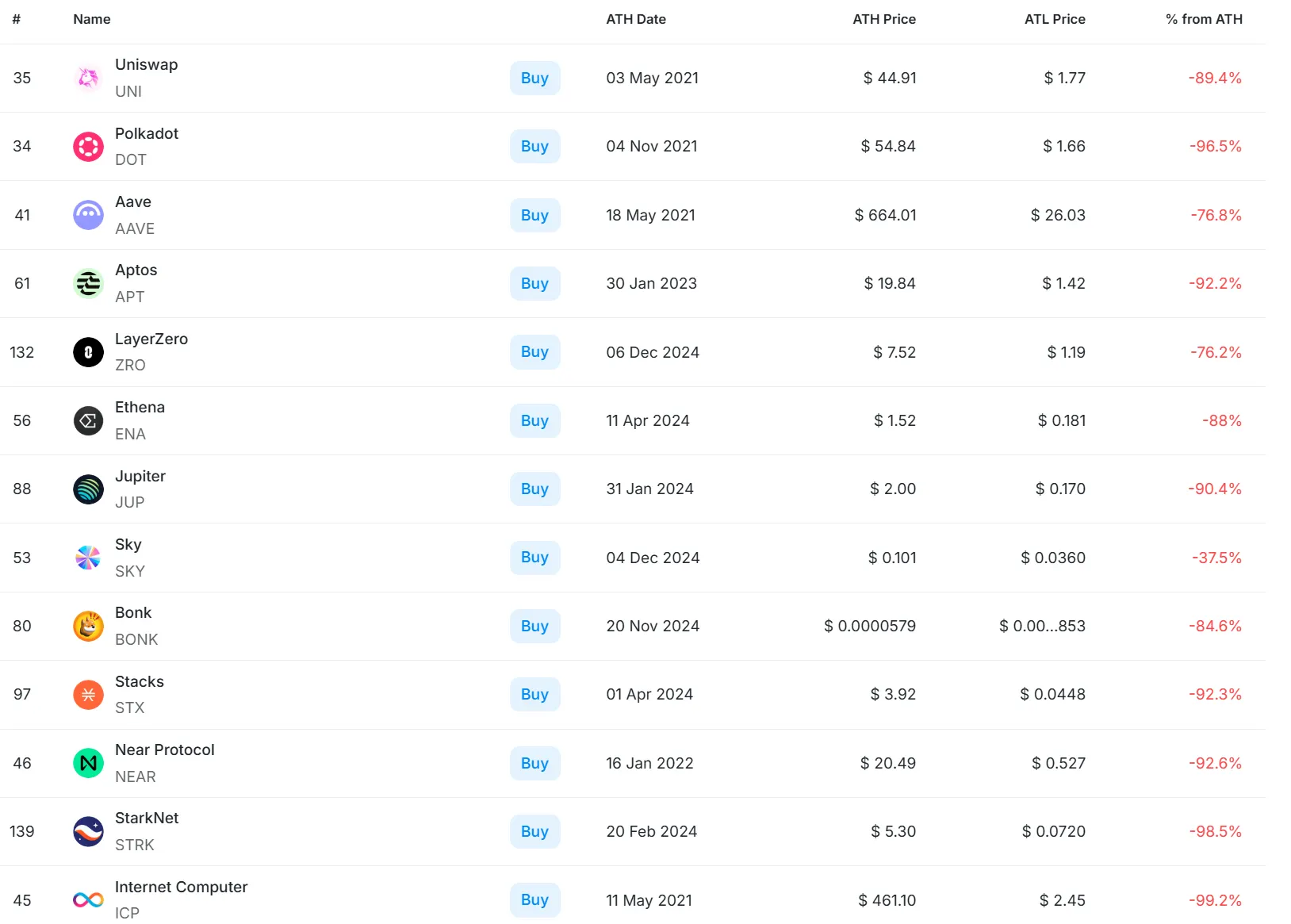 加密代币市值前 150 的各个叙事赛道龙头当前价格相对最高价格跌幅