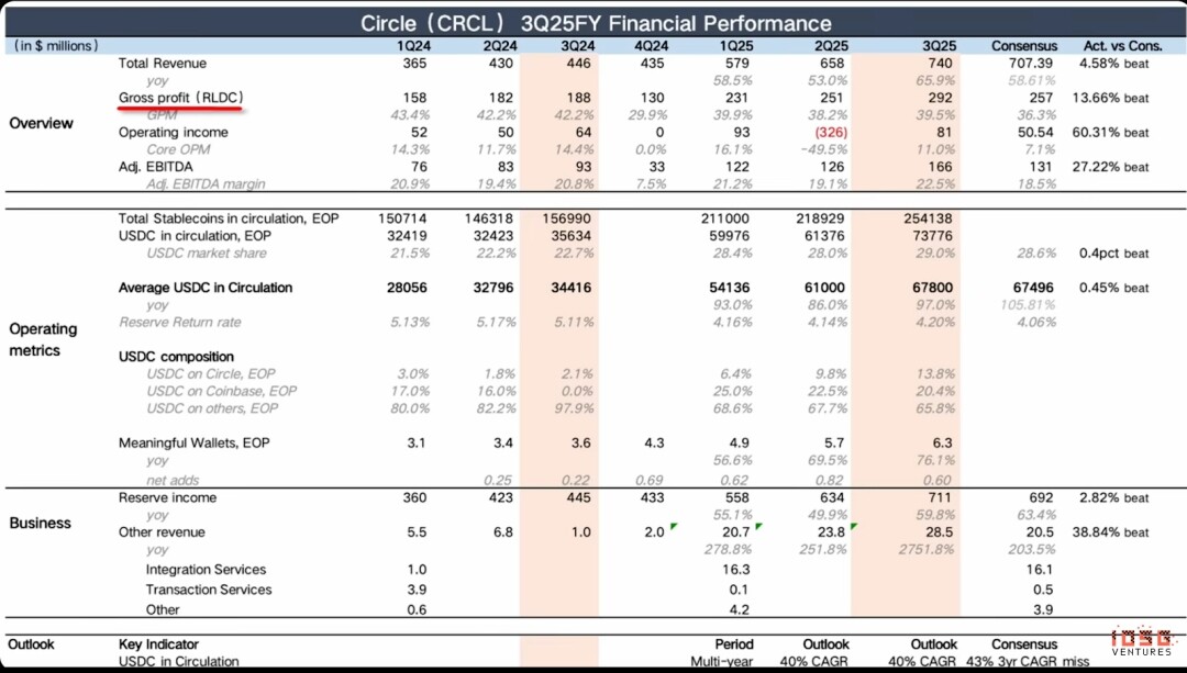 可以看到其它收入是 28.5M,大幅超过了市场的预期。但鉴于去年同期基数仅为 100 万美元,该同比数据参考意义有限。更具实际意义的环比数据显示,本季度增速为 20%,较上一季度的 15% 有所加快,表明该收入板块确实在快速增长。然而,目前“其他收入”在总营收中占比仍不足 4%,要改变 Circle 单一的收入结构尚需时日。