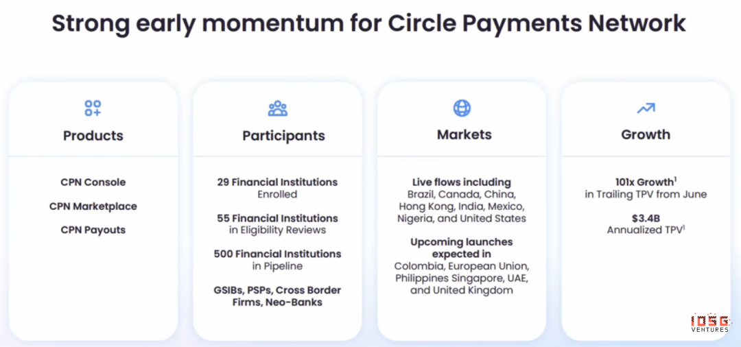 第二,CPN (Circle Payments Network):面向机构的 B2B 支付网络,为大企业和金融机构提供基于 USDC 的跨境支付与结算服务。