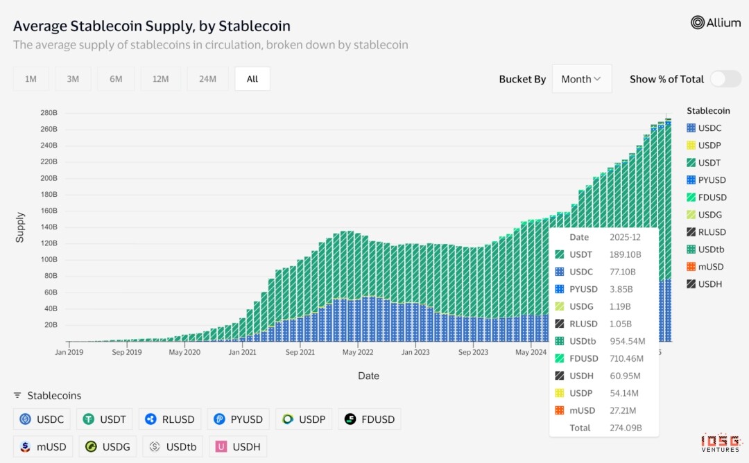 加密卡使用户能够在传统商家使用稳定币和加密货币余额进行消费,已成为数字支付领域增长最快的细分市场之一。交易量从 2023 年初的每月约 1 亿美元增长到 2025 年底的超过 15 亿美元,复合年增长率高达 106%。按年计算,该市场规模现已超过 180 亿美元,与同期仅增长 5% 的点对点稳定币转账(190 亿美元)不相上下。