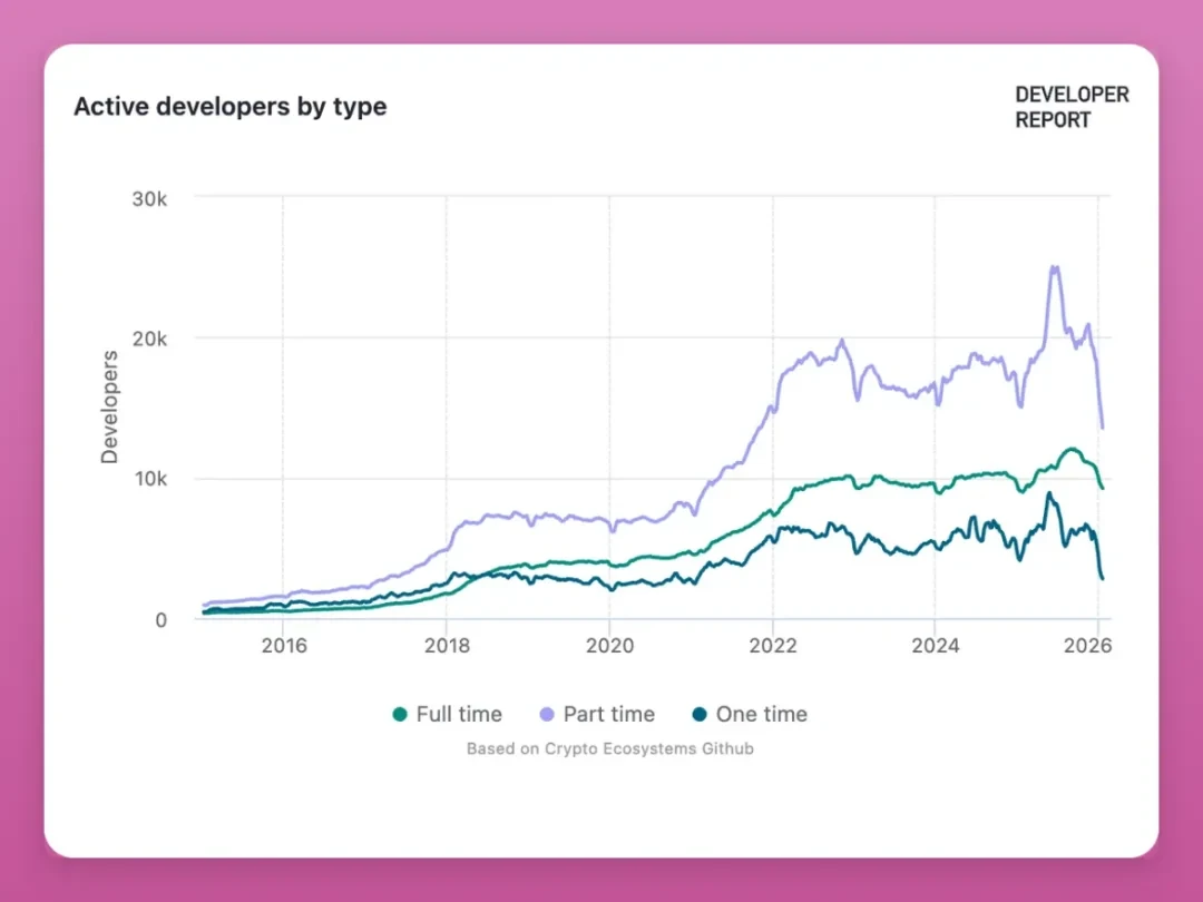 此次开发者数量下滑,主要是兼职开发者和新入门开发者离场所致。2024-2025 年的市场周期中,大批开发者涌入行业,试图通过空投和代币激励快速获利,而当这些红利消失,他们便选择离开。