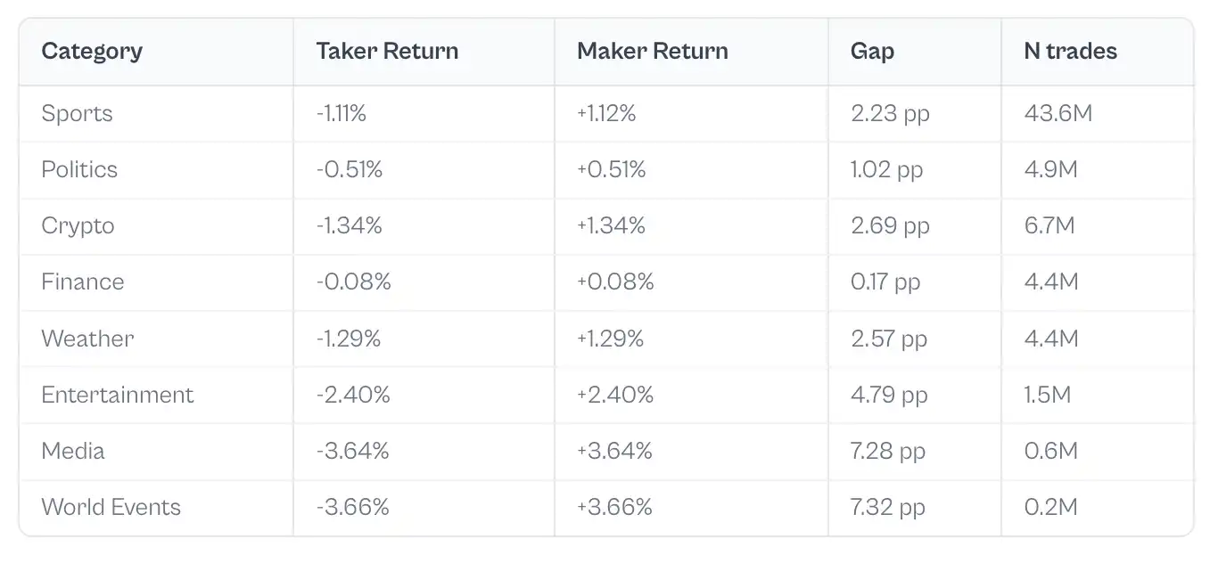 而在另一端,世界大事和媒体显示的差距超过 7 个百分点。体育作为交易量最大的类别,表现出 2.23 个百分点的适度差距。考虑到 61 亿美元的吃单量,即使是这适度的差距也产生了巨大的财富转移。