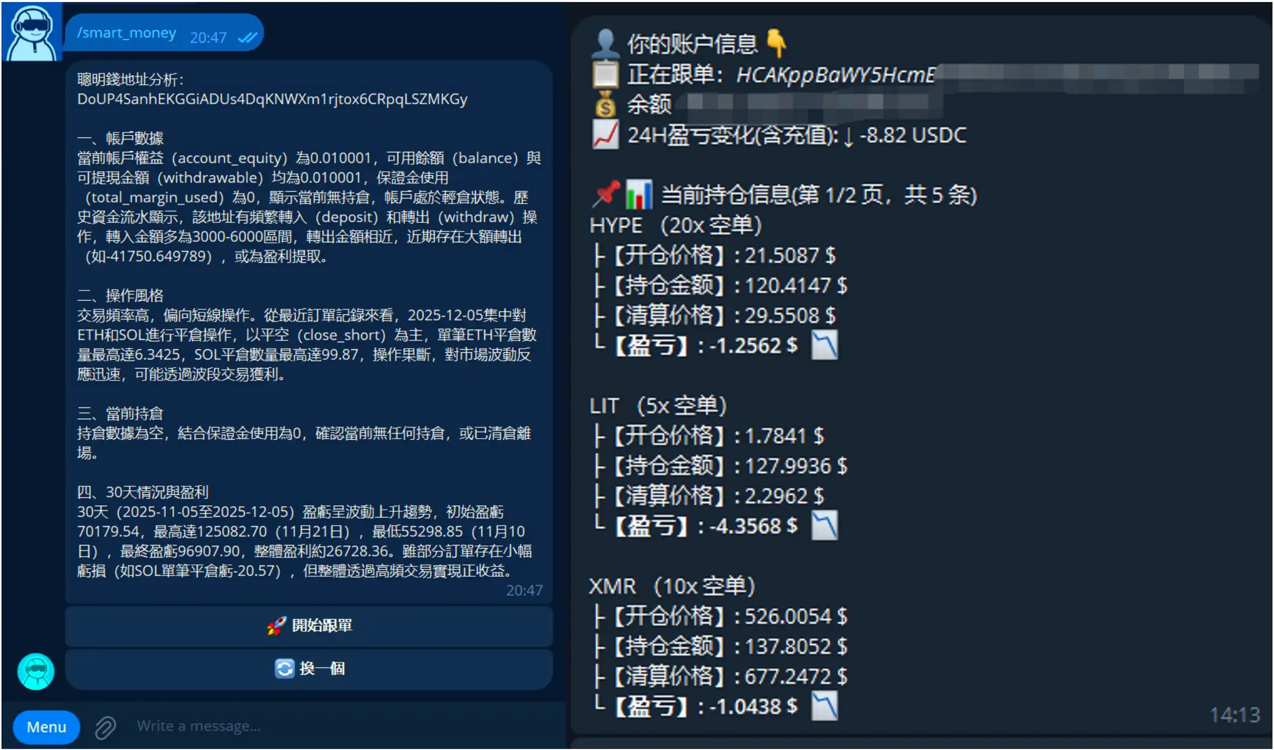 目前除了手动开单积累交易量之外,也有一些工具可以帮我们「解放双手」。笔者从 Pacifica 的 Builder Program(官方组织的生态建设活动)中找了一个跟单产品「Coinbob Pacifica」,基于 Telegram 的 Bot,操作比较简单易上手,而且还支持跟单 Hyperliquild 地址,可以实现跨平台跟单的同时获得积分。相比手动交易,工具对于跟单地址的依赖性比较强,一定程度或许会增加磨损,因此在聪明钱地址筛选上要下些功夫。