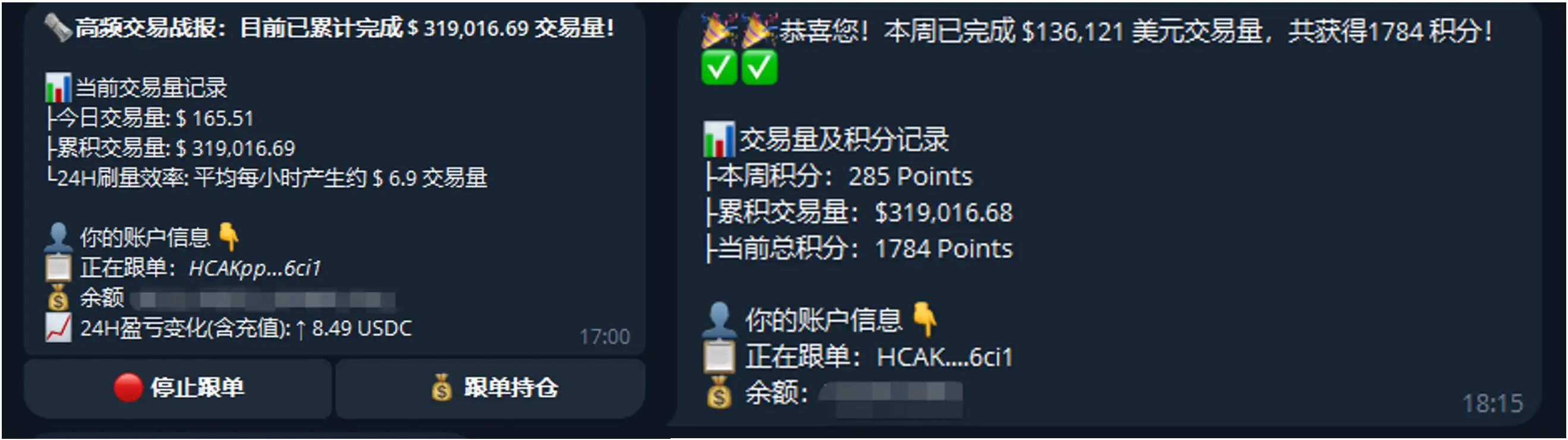 这款 Bot 也给推荐了一些合适的跟单地址,不过笔者也很机智的选择了跟单自己的地址,这样既可以控制交易磨损和交易策略,还能同时进行两个账户积分。