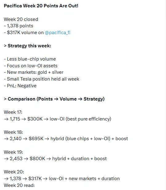 目前市场上仍有不少 Perp DEX 尚未推出代币,而为了吸引更多生态用户,积分奖励往往是有效方式。本文将为大家介绍 Solana 生态永续合约平台 Pacifica 的积分攻略,自去年 6 月上线,Pacifica 在 9 月后驶入发展快车道,当前总交易量已突破 1000 亿美元。在当前 Pacifica 早期红利窗口期,如何以最低的单积分成本、实现高效的交易量积累,已成为所有策略型交易者关注的核心。本文结合笔者亲身实践与社区数据反馈,旨在为读者梳理出一套优化成本、提升效率的积分积累策略。(关于如何注册并开始您的 Pacifica 旅程,可参考此前指南:《Pacifica 交易教程:每周 1000 万积分奖励,新手如何抢占早期红利》