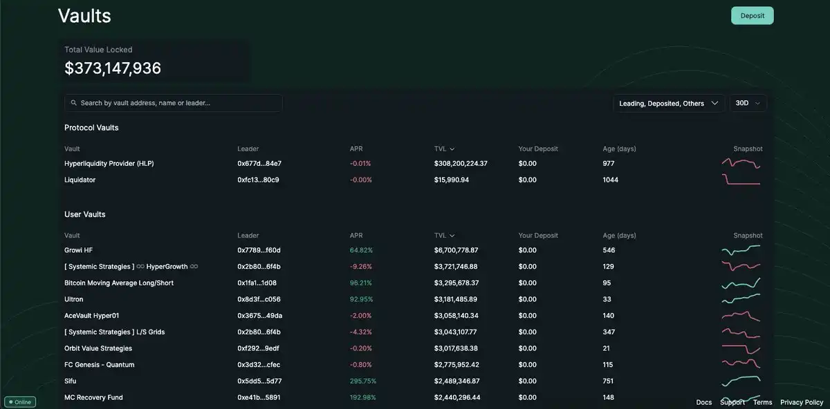 HyperLiquid 金库:Hyperliquid 金库是一项功能,允许用户通过跟随交易策略进行团队合作并盈利。主要有两种类型:协议金库和用户金库。