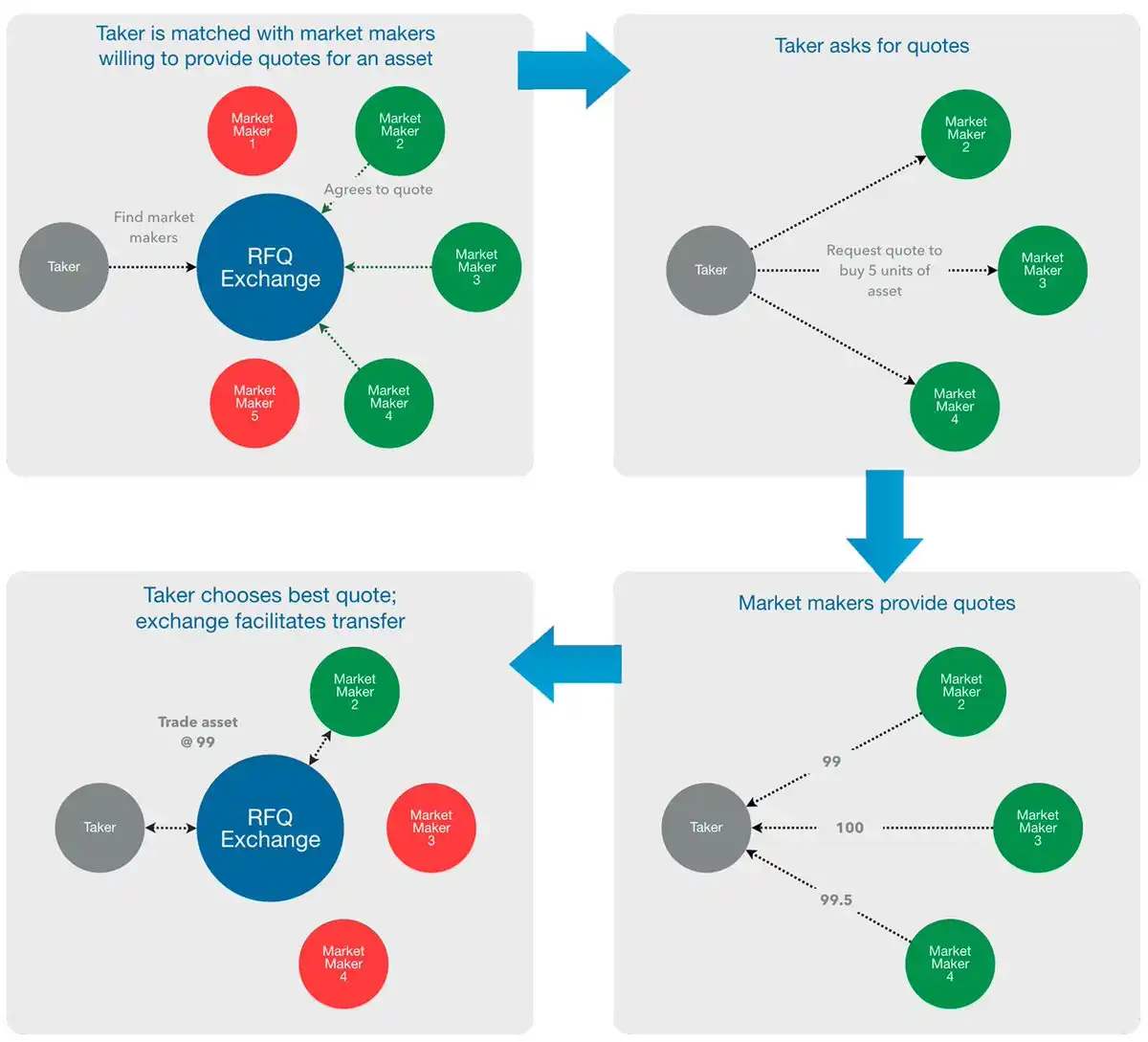 在高层次上,RFQ 系统由寻求报价方请求报价和报价方以买入和/或卖出价回应组成。通用的 RFQ 流程(在协议层面)如下:
