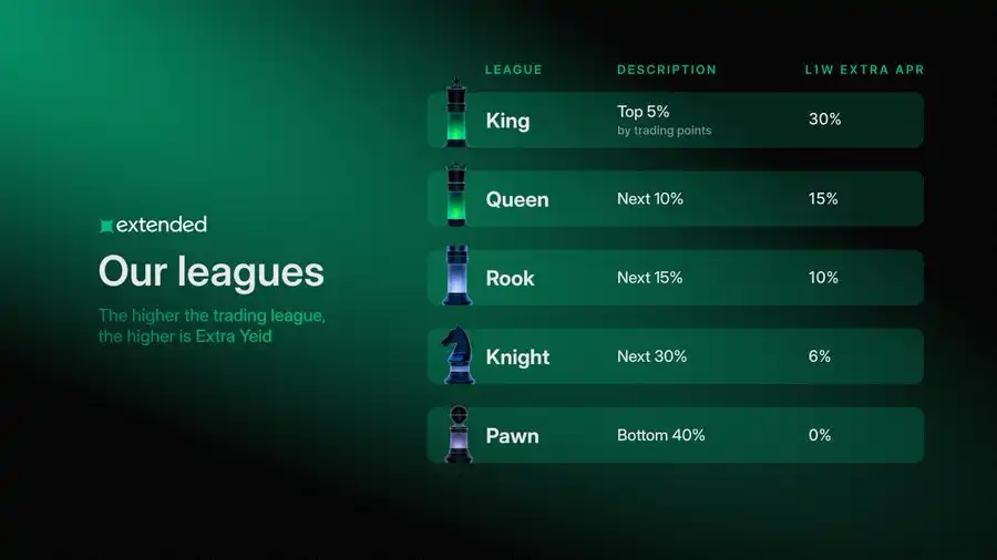 特定用户获得的额外收益金额取决于他们的交易联盟等级。交易联盟等级越高,额外收益年化利率越高。Extended 的交易联盟等级是基于百分位排名的,取决于用户的总交易积分: