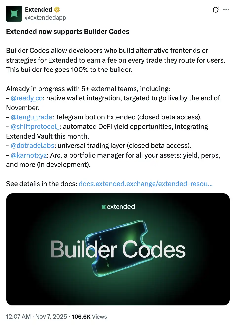 Extended 支持构建者代码,这使为 Extended 构建替代前端的开发者能够在其为用户路由的每笔交易中赚取构建者费用。此费用 100% 归构建者所有,并按订单定义。