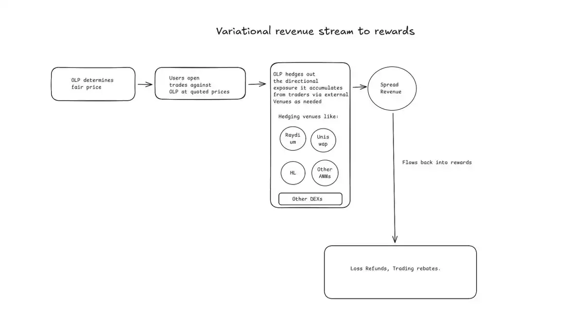 Variational 则走向了一个完全不同的方向,采用基于 RFQ 的聚合器模型,抽象了跨场所的碎片化流动性,并将部分做市利润返还给交易者。