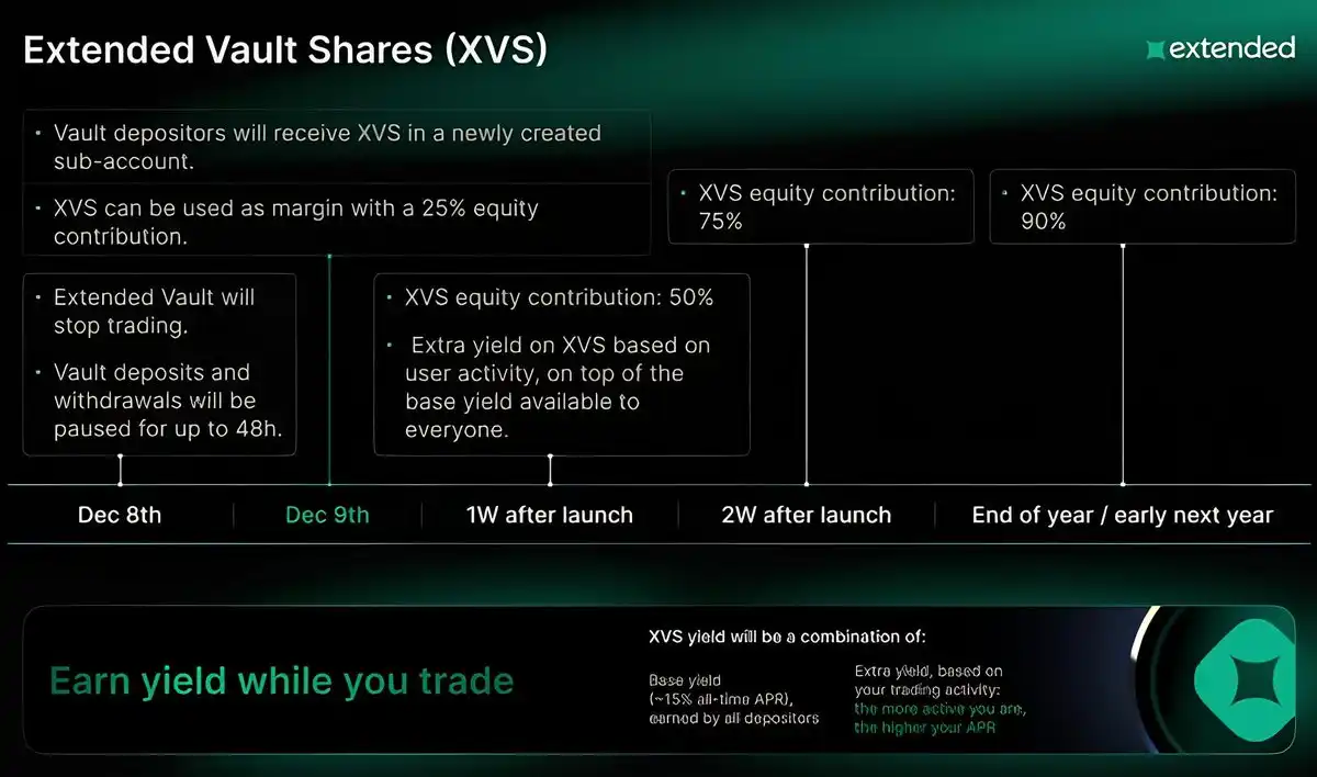 Extended 通过其金库系统脱颖而出,该系统允许交易者在交易永续合约的同时赚取收益。通过 Extended Vault Shares (XVS),存款人可以在其抵押品上获得约 15% 年化利率的基础收益,并根据交易活动获得额外收益。