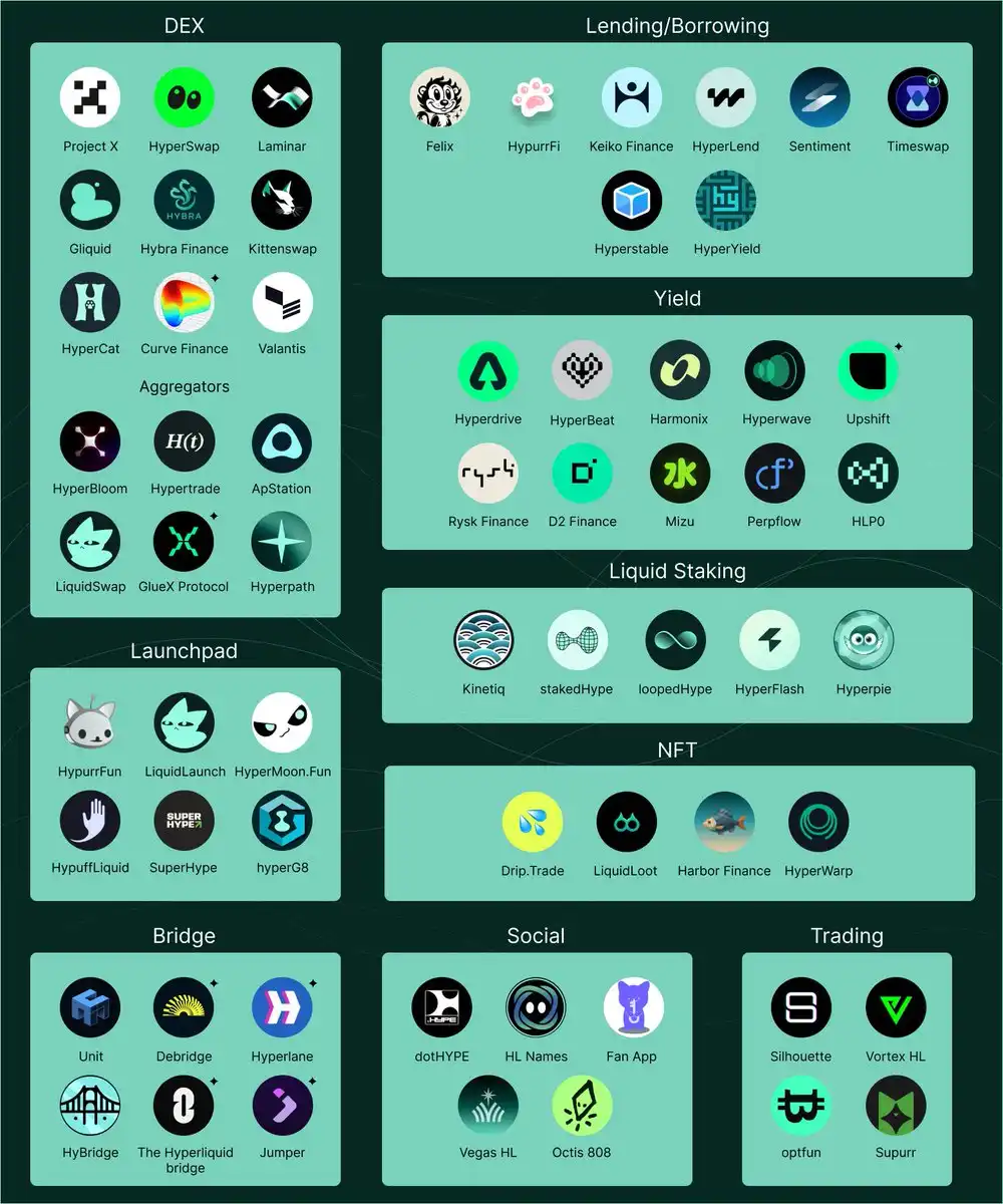 在此格局中,HypurrFi、Felix、Harmonix、Kinetiq、HyperBeat、HyperLend 和 Project X 等核心协议锚定了跨链的资本流动。