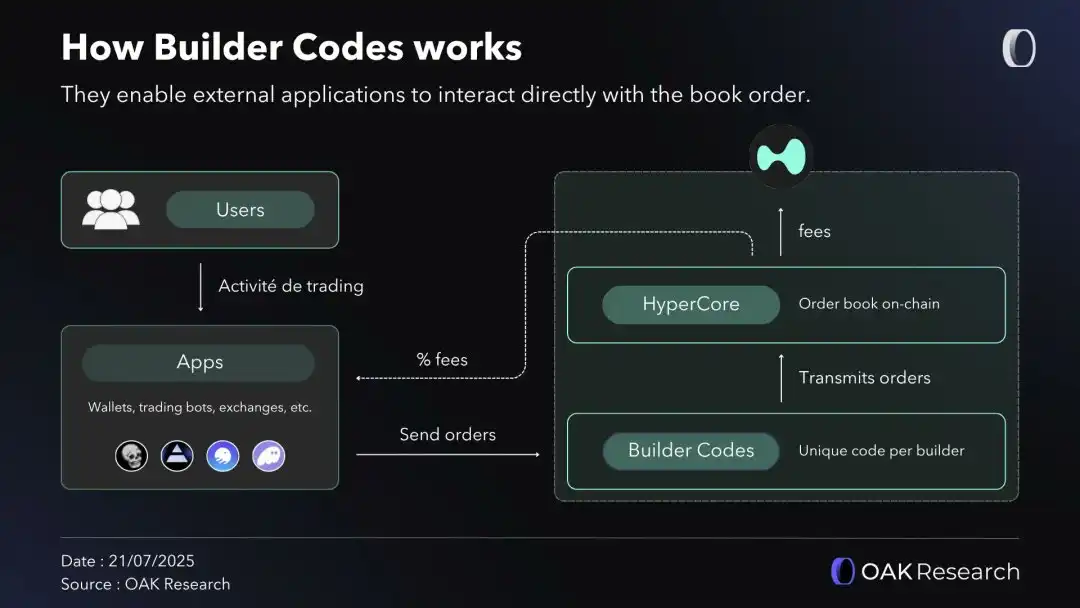 构建者代码是唯一的标识符,使任何开发者能够将其前端连接到 Hyperliquid 的后端。因此,通过此标识符执行的每一笔交易都将通过 Hyperliquid 的订单簿路由,并自动将一定比例的交易费支付给开发者。收取的构建者费用最高为永续合约的 0.1% 和现货的 1%。