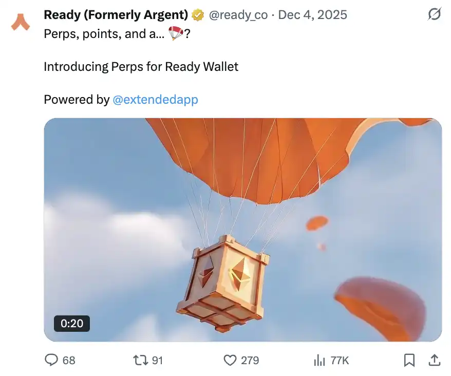 除了扩展其产品供应外,Extended 已与钱包原生集成,使用户能够直接在钱包界面内进行永续交易,类似于现今访问代币兑换的方式。这种集成为更广泛的散户用户群打开了永续合约的大门。
