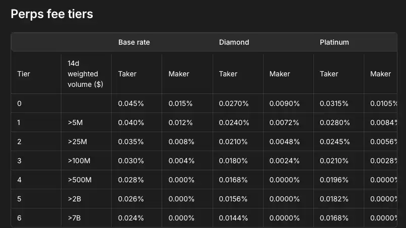 对于每个用户,所有资产(包括永续合约、HIP-3 永续合约和现货)共享一个费率等级。