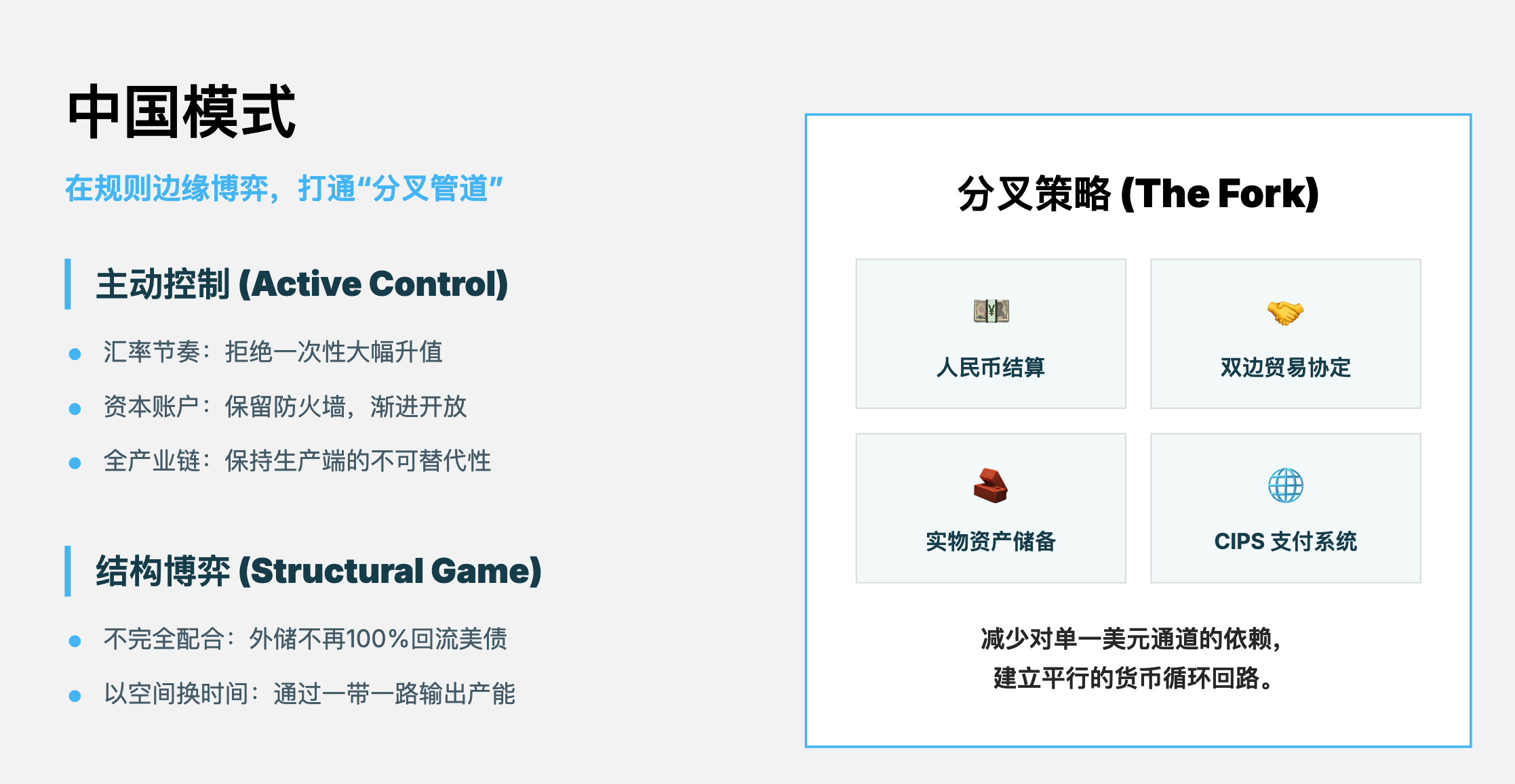 中国进入这一体系的时间更晚,所处的发展阶段和内部约束也与日本显著不同。面对顺差扩张与外部压力,中国并未完全选择通过价格和金融渠道迅速出清,而是在汇率管理、资本账户管制和产业升级的框架下,尽可能保留政策自主性。这一选择使中国长期处于争议之中,被指责为“扭曲规则”或“搭便车”,但从治理角度看,这更像是在既有体系内为内部转型争取时间和空间的策略安排,而非简单的制度套利。