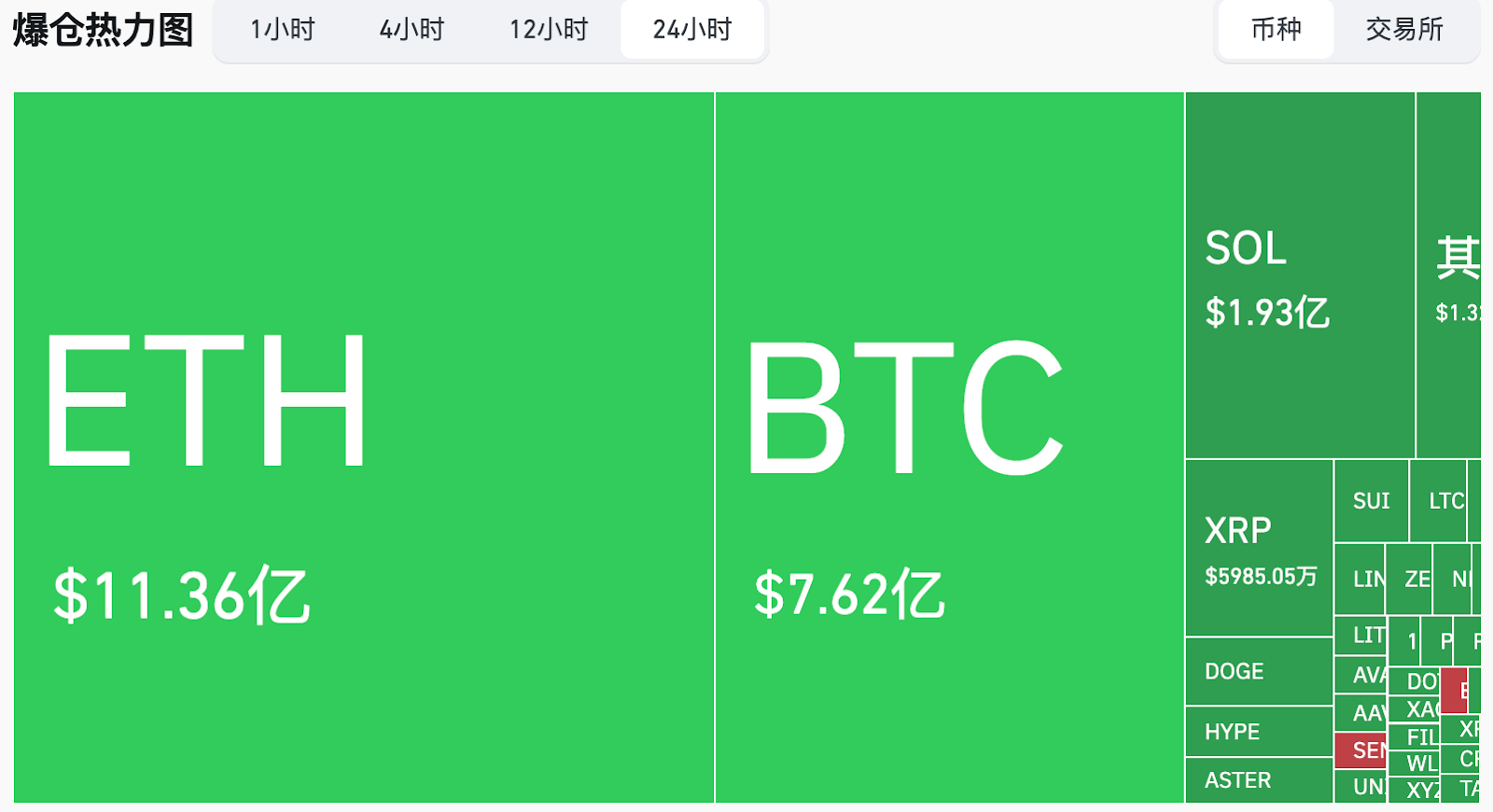 衍生品方面,过去 24 小时 25.22 亿美元,其中多单爆仓 24.11 亿美元,空单爆仓 1.15 亿美元。最大单笔爆仓单发生在 Hyperliquid - ETH-USD ,价值约 2.22 亿美元。值得注意的是,仅过去 1 小时,爆仓金额就高达 11.4 亿美元。