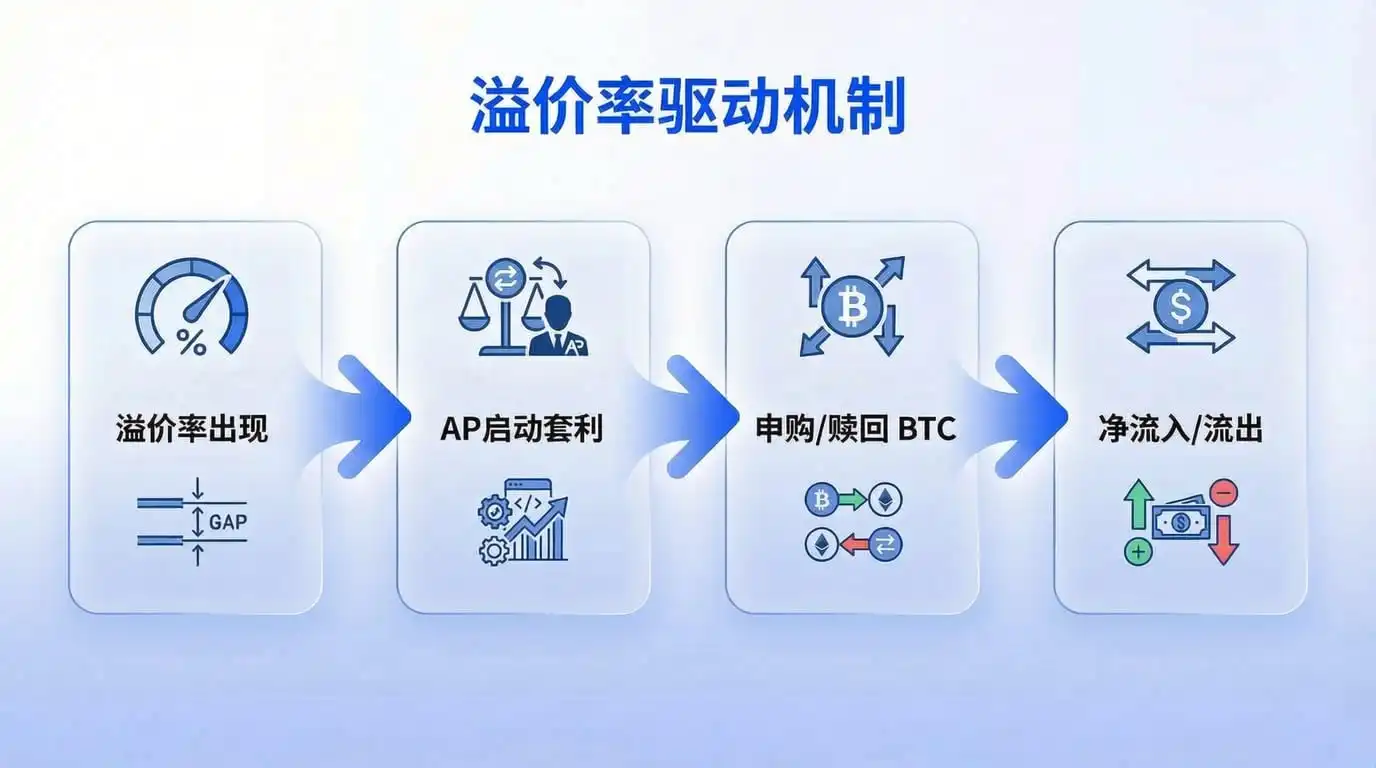 溢价率出现→AP 启动套利→产生申购或者赎回→形成净流入或净流出。