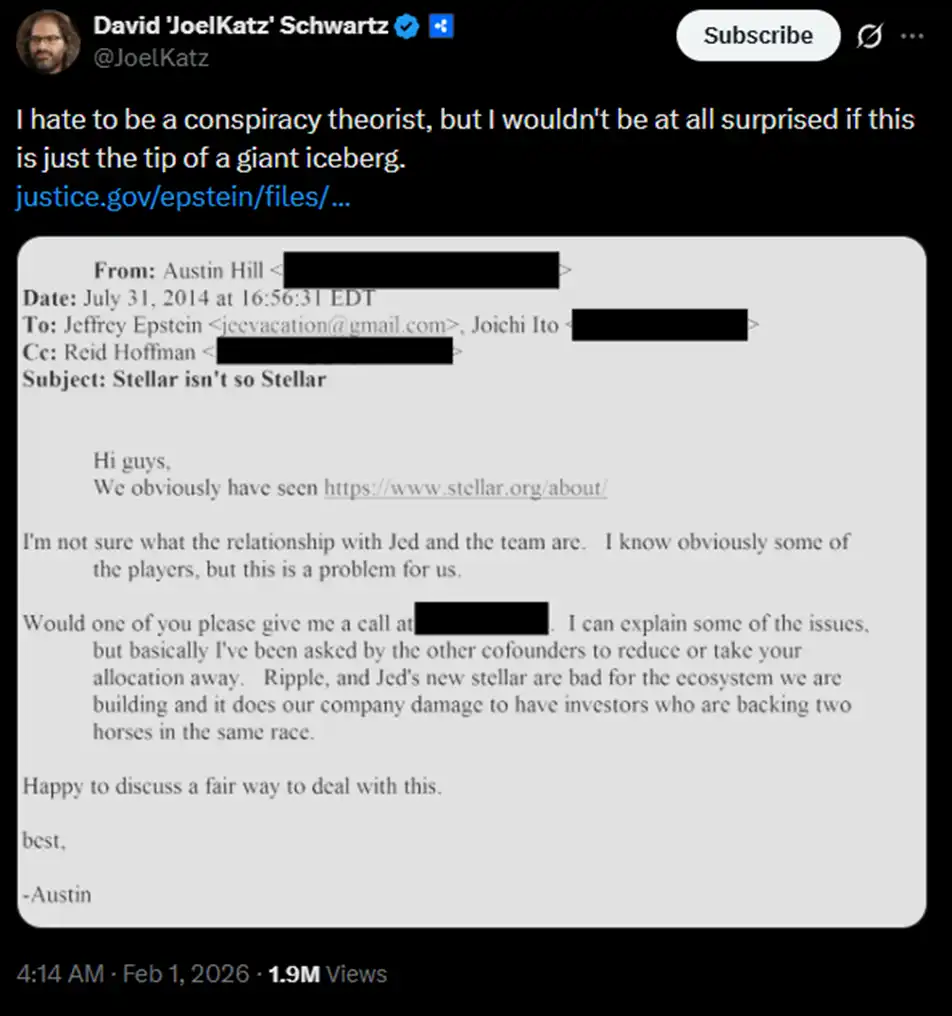 这里的解读在英文圈也存在一定的分歧,结合上下文,我个人倾向于采纳的解读是,爱泼斯坦在当时可能也投资了 Ripple/Stellar,这引起了 Blockstream 的不满,以至于 Austin Hill 在邮件中表示「我被其它的联创要求减少甚至取消你们的份额」。