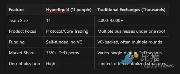 这种打法的背后,是 Hyperliquid 极具传奇色彩的团队优势。很难想象,支撑起这个年化收入超 11 亿美元、交易量比肩一线 CEX 的庞然大物的,竟然是一个仅有约 11 人的核心团队。这支由哈佛、MIT 学霸及顶级量化对冲基金精英组成的「特种兵」团队,创造了人均年化贡献收入超过 1 亿美元的惊人效率,正因为团队极度精简、决策路径短,Hyperliquid 才能快速迭代。