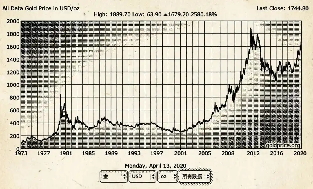 你看黄金,1972 年的时候,它是 46 美元一盎司,2020 年的时候,它新高到了 1744 美元一盎司,总共翻了 37.9 倍,那为啥我们不多造些黄金来满足需求呢?原因就在于黄金的开采量受制于开采技术和花费。如果你做一件事情花的比最后挣的还多,你肯定不干。