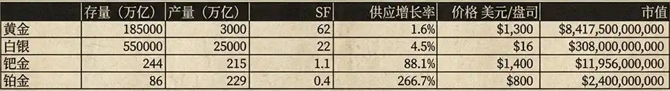 在图里,你能看到,黄金的 SF 是 62,白银的是 22。这是啥意思呢?就是说你要花 62 年的时间才能生产出和现在一样多的黄金,白银你需要花 22 年,铂金需要 0.4 年,这都说明了一个事情:它们特别稀缺。