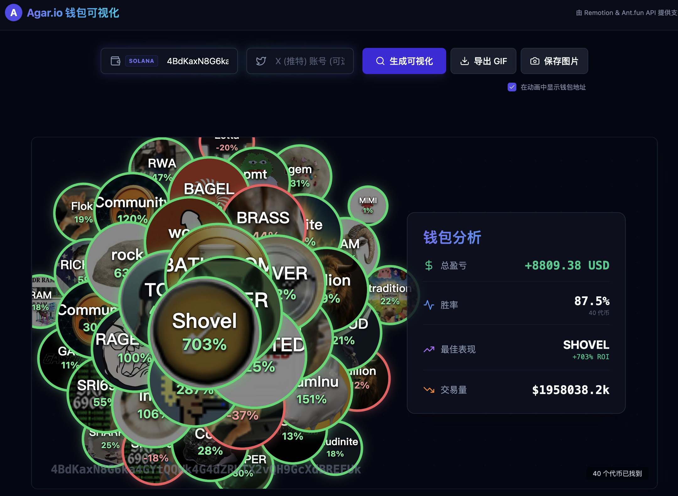 - 地址即生成视频:输入 Solana 钱包地址,即可生成 Agar.io 风格的动态视频,每个 Token 以“球”的形式呈现,大小对应资产权重与盈亏表现
